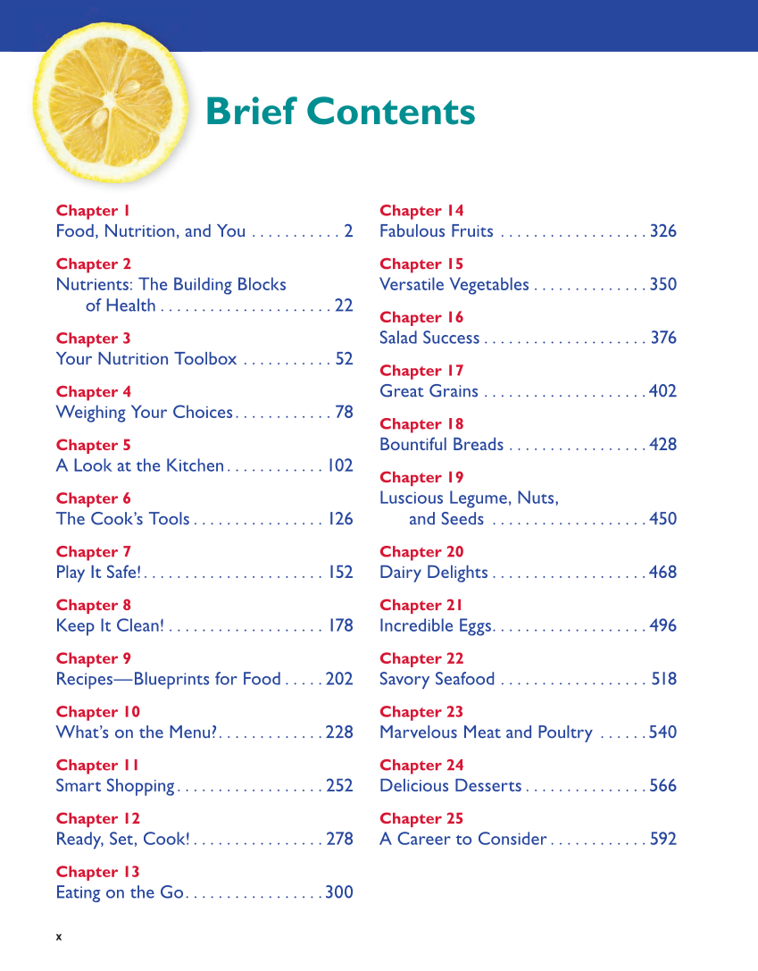 x Brief Contents Chapter 1 Food, Nutrition, and You . . . . . . . . . . . 2 Chapter 2 Nutrients: The Building Blocks of Health . . . . . . . . . . . . . . . . . . . . . 22 Chapter 3 Your Nutrition Toolbox . . . . . . . . . . . 52 Chapter 4 Weighing Your Choices. . . . . . . . . . . . 78 Chapter 5 A Look at the Kitchen. . . . . . . . . . . . 102 Chapter 6 The Cook’s Tools . . . . . . . . . . . . . . . . 126 Chapter 7 Play It Safe!. . . . . . . . . . . . . . . . . . . . . . 152 Chapter 8 Keep It Clean! . . . . . . . . . . . . . . . . . . . 178 Chapter 9 Recipes—Blueprints for Food . . . . . 202 Chapter 10 What’s on the Menu?. . . . . . . . . . . . .228 Chapter 11 Smart Shopping. . . . . . . . . . . . . . . . . . 252 Chapter 12 Ready, Set, Cook! . . . . . . . . . . . . . . . . 278 Chapter 13 Eating on the Go. . . . . . . . . . . . . . . . .300 Chapter 14 Fabulous Fruits . . . . . . . . . . . . . . . . . . 326 Chapter 15 Versatile Vegetables . . . . . . . . . . . . . . 350 Chapter 16 Salad Success . . . . . . . . . . . . . . . . . . . . 376 Chapter 17 Great Grains . . . . . . . . . . . . . . . . . . . .402 Chapter 18 Bountiful Breads . . . . . . . . . . . . . . . . . 428 Chapter 19 Luscious Legume, Nuts, and Seeds . . . . . . . . . . . . . . . . . . . 450 Chapter 20 Dairy Delights . . . . . . . . . . . . . . . . . . .468 Chapter 21 Incredible Eggs. . . . . . . . . . . . . . . . . . . 496 Chapter 22 Savory Seafood . . . . . . . . . . . . . . . . . . 518 Chapter 23 Marvelous Meat and Poultry . . . . . .540 Chapter 24 Delicious Desserts . . . . . . . . . . . . . . . 566 Chapter 25 A Career to Consider . . . . . . . . . . . . 592