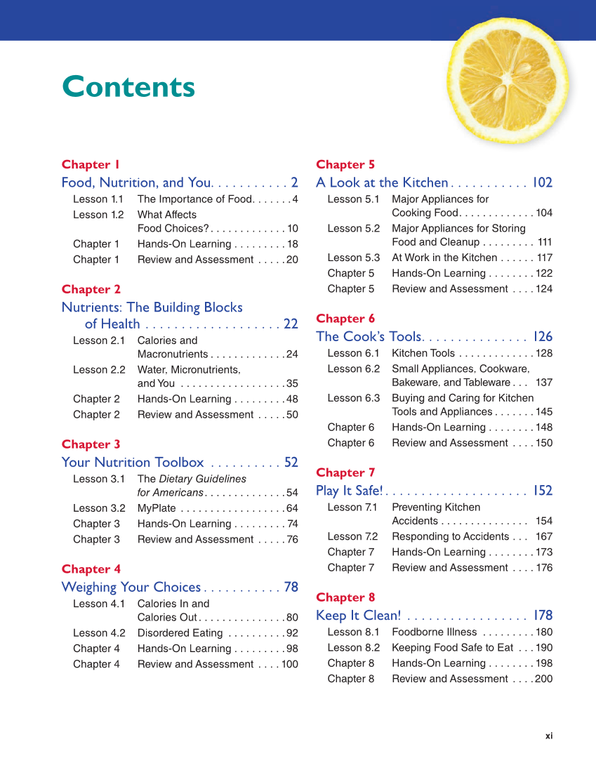 xi Contents Chapter 1 Food, Nutrition, and You. . . . . . . . . . . 2 Lesson 1.1 The Importance of Food . . . . . . .4 Lesson 1.2 What Affects Food Choices? . . . . . . . . . . . . . 10 Chapter 1 Hands-On Learning . . . . . . . . . 18 Chapter 1 Review and Assessment . . . . .20 Chapter 2 Nutrients: The Building Blocks of Health . . . . . . . . . . . . . . . . . . . 22 Lesson 2.1 Calories and Macronutrients . . . . . . . . . . . . .24 Lesson 2.2 Water, Micronutrients, and You . . . . . . . . . . . . . . . . . .35 Chapter 2 Hands-On Learning . . . . . . . . .48 Chapter 2 Review and Assessment . . . . .50 Chapter 3 Your Nutrition Toolbox . . . . . . . . . . 52 Lesson 3.1 The Dietary Guidelines for Americans . . . . . . . . . . . . . .54 Lesson 3.2 MyPlate . . . . . . . . . . . . . . . . . .64 Chapter 3 Hands-On Learning . . . . . . . . . 74 Chapter 3 Review and Assessment . . . . . 76 Chapter 4 Weighing Your Choices . . . . . . . . . . . 78 Lesson 4.1 Calories In and Calories Out . . . . . . . . . . . . . . .80 Lesson 4.2 Disordered Eating . . . . . . . . . .92 Chapter 4 Hands-On Learning . . . . . . . . .98 Chapter 4 Review and Assessment . . . . 100 Chapter 5 A Look at the Kitchen. . . . . . . . . . . 102 Lesson 5.1 Major Appliances for Cooking Food . . . . . . . . . . . . . 104 Lesson 5.2 Major Appliances for Storing Food and Cleanup . . . . . . . . . 111 Lesson 5.3 At Work in the Kitchen . . . . . . 117 Chapter 5 Hands-On Learning . . . . . . . . 122 Chapter 5 Review and Assessment . . . . 124 Chapter 6 The Cook’s Tools. . . . . . . . . . . . . . . 126 Lesson 6.1 Kitchen Tools . . . . . . . . . . . . . 128 Lesson 6.2 Small Appliances, Cookware, Bakeware, and Tableware . . . 137 Lesson 6.3 Buying and Caring for Kitchen Tools and Appliances . . . . . . . 145 Chapter 6 Hands-On Learning . . . . . . . . 148 Chapter 6 Review and Assessment . . . . 150 Chapter 7 Play It Safe!. . . . . . . . . . . . . . . . . . . . 152 Lesson 7.1 Preventing Kitchen Accidents . . . . . . . . . . . . . . . 154 Lesson 7.2 Responding to Accidents . . . 167 Chapter 7 Hands-On Learning . . . . . . . . 173 Chapter 7 Review and Assessment . . . . 176 Chapter 8 Keep It Clean! . . . . . . . . . . . . . . . . . 178 Lesson 8.1 Foodborne Illness . . . . . . . . . 180 Lesson 8.2 Keeping Food Safe to Eat . . . 190 Chapter 8 Hands-On Learning . . . . . . . . 198 Chapter 8 Review and Assessment . . . .200