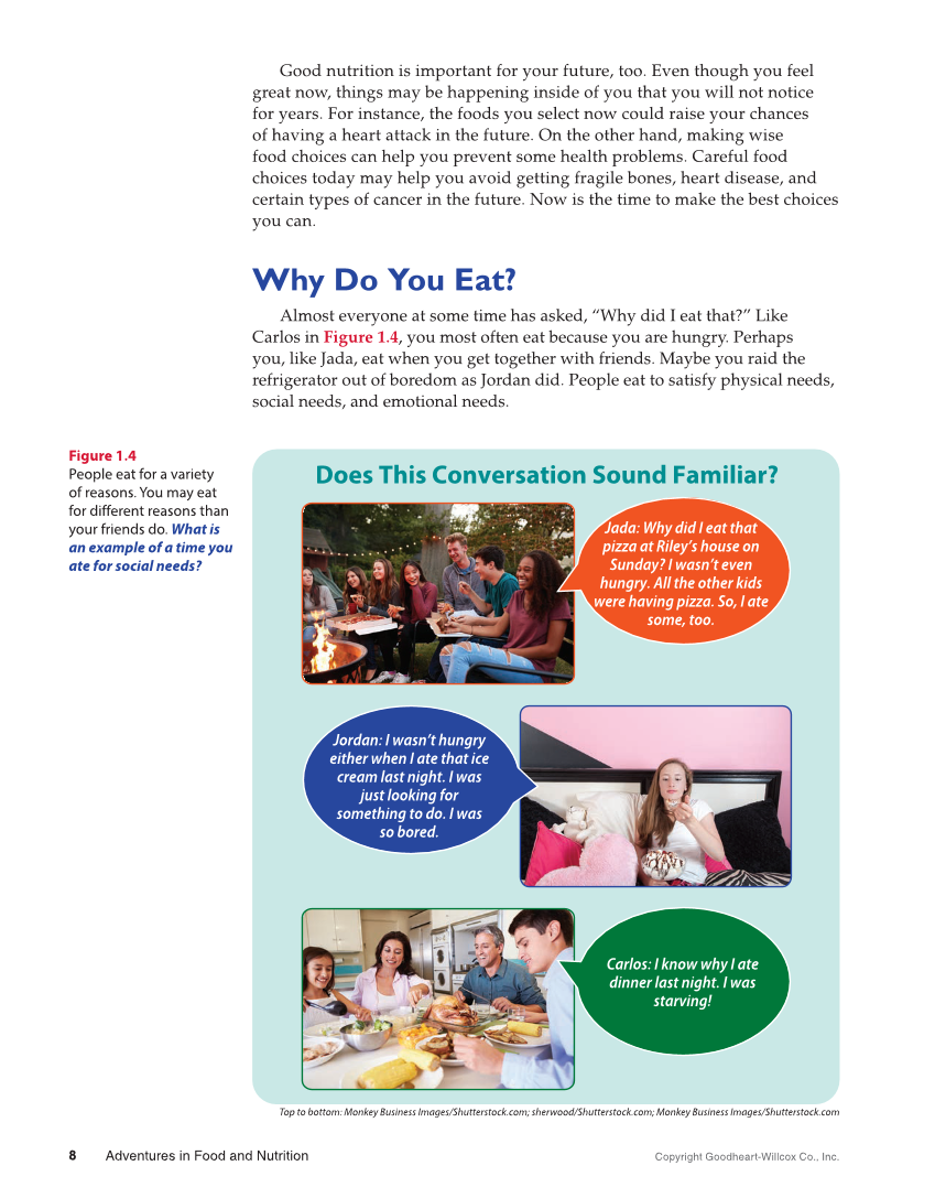 Good nutrition is important for your future, too. Even though you feel great now, things may be happening inside of you that you will not notice for years. For instance, the foods you select now could raise your chances of having a heart attack in the future. On the other hand, making wise food choices can help you prevent some health problems. Careful food choices today may help you avoid getting fragile bones, heart disease, and certain types of cancer in the future. Now is the time to make the best choices you can. Why Do You Eat? Almost everyone at some time has asked, “Why did I eat that?” Like Carlos in Figure 1.4, you most often eat because you are hungry. Perhaps you, like Jada, eat when you get together with friends. Maybe you raid the refrigerator out of boredom as Jordan did. People eat to satisfy physical needs, social needs, and emotional needs. Does This Conversation Sound Familiar? Jada: Why did I eat that pizza at Riley’s house on Sunday? I wasn’t even hungry. All the other kids were having pizza. So, I ate some, too. Carlos: I know why I ate dinner last night. I was starving! Jordan: I wasn’t hungry either when I ate that ice cream last night. I was just looking for something to do. I was so bored. Top to bottom: Monkey Business Images/Shutterstock.com sherwood/Shutterstock.com Monkey Business Images/Shutterstock.com Figure 1.4 People eat for a variety of reasons. You may eat for different reasons than your friends do. What is an example of a time you ate for social needs? Adventures in Food and Nutrition Copyright Goodheart-Willcox Co., Inc. 8