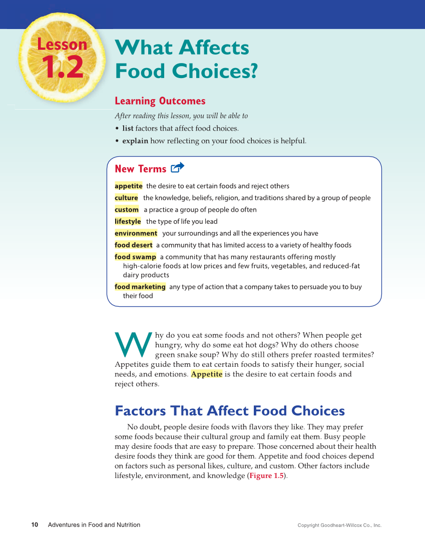 Lesson 1.2 What Affects Food Choices? Learning Outcomes After reading this lesson, you will be able to • list factors that affect food choices. • explain how reflecting on your food choices is helpful. W hy do you eat some foods and not others? When people get hungry, why do some eat hot dogs? Why do others choose green snake soup? Why do still others prefer roasted termites? Appetites guide them to eat certain foods to satisfy their hunger, social needs, and emotions. Appetite is the desire to eat certain foods and reject others. Factors That Affect Food Choices No doubt, people desire foods with flavors they like. They may prefer some foods because their cultural group and family eat them. Busy people may desire foods that are easy to prepare. Those concerned about their health desire foods they think are good for them. Appetite and food choices depend on factors such as personal likes, culture, and custom. Other factors include lifestyle, environment, and knowledge (Figure 1.5). New Terms appetite the desire to eat certain foods and reject others culture the knowledge, beliefs, religion, and traditions shared by a group of people custom a practice a group of people do often lifestyle the type of life you lead environment your surroundings and all the experiences you have food desert a community that has limited access to a variety of healthy foods food swamp a community that has many restaurants offering mostly high-calorie foods at low prices and few fruits, vegetables, and reduced-fat dairy products food marketing any type of action that a company takes to persuade you to buy their food Adventures in Food and Nutrition Copyright Goodheart-Willcox Co., Inc. 10