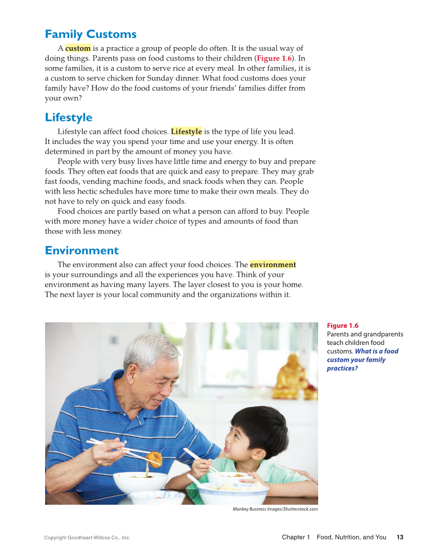 Family Customs A custom is a practice a group of people do often. It is the usual way of doing things. Parents pass on food customs to their children (Figure 1.6). In some families, it is a custom to serve rice at every meal. In other families, it is a custom to serve chicken for Sunday dinner. What food customs does your family have? How do the food customs of your friends’ families differ from your own? Lifestyle Lifestyle can affect food choices. Lifestyle is the type of life you lead. It includes the way you spend your time and use your energy. It is often determined in part by the amount of money you have. People with very busy lives have little time and energy to buy and prepare foods. They often eat foods that are quick and easy to prepare. They may grab fast foods, vending machine foods, and snack foods when they can. People with less hectic schedules have more time to make their own meals. They do not have to rely on quick and easy foods. Food choices are partly based on what a person can afford to buy. People with more money have a wider choice of types and amounts of food than those with less money. Environment The environment also can affect your food choices. The environment is your surroundings and all the experiences you have. Think of your environment as having many layers. The layer closest to you is your home. The next layer is your local community and the organizations within it. Monkey Business Images/Shutterstock.com Figure 1.6 Parents and grandparents teach children food customs. What is a food custom your family practices? 13 Copyright Goodheart-Willcox Co., Inc. Chapter 1 Food, Nutrition, and You