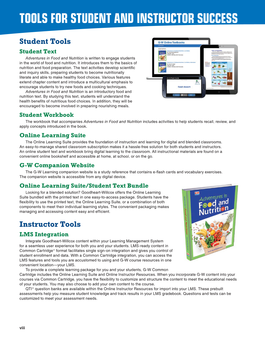 viii Student Tools Student Text Adventures in Food and Nutrition is written to engage students in the world of food and nutrition. It introduces them to the basics of nutrition and food preparation. The text activities develop scientific and inquiry skills, preparing students to become nutritionally literate and able to make healthy food choices. Various features extend chapter content and introduce a multicultural emphasis to encourage students to try new foods and cooking techniques. Adventures in Food and Nutrition is an introductory food and nutrition text. By studying this text, students will understand the health benefits of nutritious food choices. In addition, they will be encouraged to become involved in preparing nourishing meals. Student Workbook The workbook that accompanies Adventures in Food and Nutrition includes activities to help students recall, review, and apply concepts introduced in the book. Online Learning Suite The Online Learning Suite provides the foundation of instruction and learning for digital and blended classrooms. An easy-to-manage shared classroom subscription makes it a hassle-free solution for both students and instructors. An online student text and workbook bring digital learning to the classroom. All instructional materials are found on a convenient online bookshelf and accessible at home, at school, or on the go. G-W Companion Website The G-W Learning companion website is a study reference that contains e-flash cards and vocabulary exercises. The companion website is accessible from any digital device. Online Learning Suite/Student Text Bundle Looking for a blended solution? Goodheart-Willcox offers the Online Learning Suite bundled with the printed text in one easy-to-access package. Students have the flexibility to use the printed text, the Online Learning Suite, or a combination of both components to meet their individual learning styles. The convenient packaging makes managing and accessing content easy and efficient. Instructor Tools LMS Integration Integrate Goodheart-Willcox content within your Learning Management System for a seamless user experience for both you and your students. LMS-ready content in Common Cartridge® format facilitates single sign-on integration and gives you control of student enrollment and data. With a Common Cartridge integration, you can access the LMS features and tools you are accustomed to using and G-W course resources in one convenient location—your LMS. To provide a complete learning package for you and your students, G-W Common Cartridge includes the Online Learning Suite and Online Instructor Resources. When you incorporate G-W content into your courses via Common Cartridge, you have the flexibility to customize and structure the content to meet the educational needs of your students. You may also choose to add your own content to the course. QTI® question banks are available within the Online Instructor Resources for import into your LMS. These prebuilt assessments help you measure student knowledge and track results in your LMS gradebook. Questions and tests can be customized to meet your assessment needs. TOOLS FOR STUDENT AND INSTRUCTOR SUCCESS