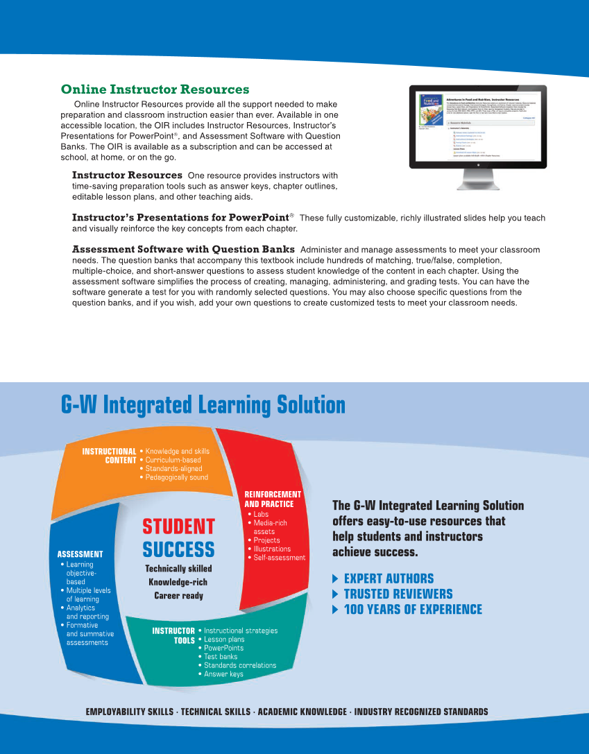 EMPLOYABILITY SKILLS ∙ TECHNICAL SKILLS ∙ ACADEMIC KNOWLEDGE ∙ INDUSTRY RECOGNIZED STANDARDS The G-W Integrated Learning Solution offers easy-to-use resources that help students and instructors achieve success. EXPERT AUTHORS TRUSTED REVIEWERS 100 YEARS OF EXPERIENCE G-W Integrated Learning Solution ASSESSMENT • Learning objective- based • Multiple levels of learning • Analytics and reporting • Formative and summative assessments • Knowledge and skills • Curriculum-based • Standards-aligned • Pedagogically sound INSTRUCTIONAL CONTENT INSTRUCTOR TOOLS • Instructional strategies • Lesson plans • PowerPoints • Test banks • Standards correlations • Answer keys REINFORCEMENT AND PRACTICE • Labs • Media-rich assets • Projects • Illustrations • Self-assessment STUDENT SUCCESS Technically skilled Knowledge-rich Career ready Online Instructor Resources Online Instructor Resources provide all the support needed to make preparation and classroom instruction easier than ever. Available in one accessible location, the OIR includes Instructor Resources, Instructor’s Presentations for PowerPoint®, and Assessment Software with Question Banks. The OIR is available as a subscription and can be accessed at school, at home, or on the go. Instructor Resources One resource provides instructors with time-saving preparation tools such as answer keys, chapter outlines, editable lesson plans, and other teaching aids. Instructor’s Presentations for PowerPoint® These fully customizable, richly illustrated slides help you teach and visually reinforce the key concepts from each chapter. Assessment Software with Question Banks Administer and manage assessments to meet your classroom needs. The question banks that accompany this textbook include hundreds of matching, true/false, completion, multiple-choice, and short-answer questions to assess student knowledge of the content in each chapter. Using the assessment software simplifies the process of creating, managing, administering, and grading tests. You can have the software generate a test for you with randomly selected questions. You may also choose specific questions from the question banks, and if you wish, add your own questions to create customized tests to meet your classroom needs.