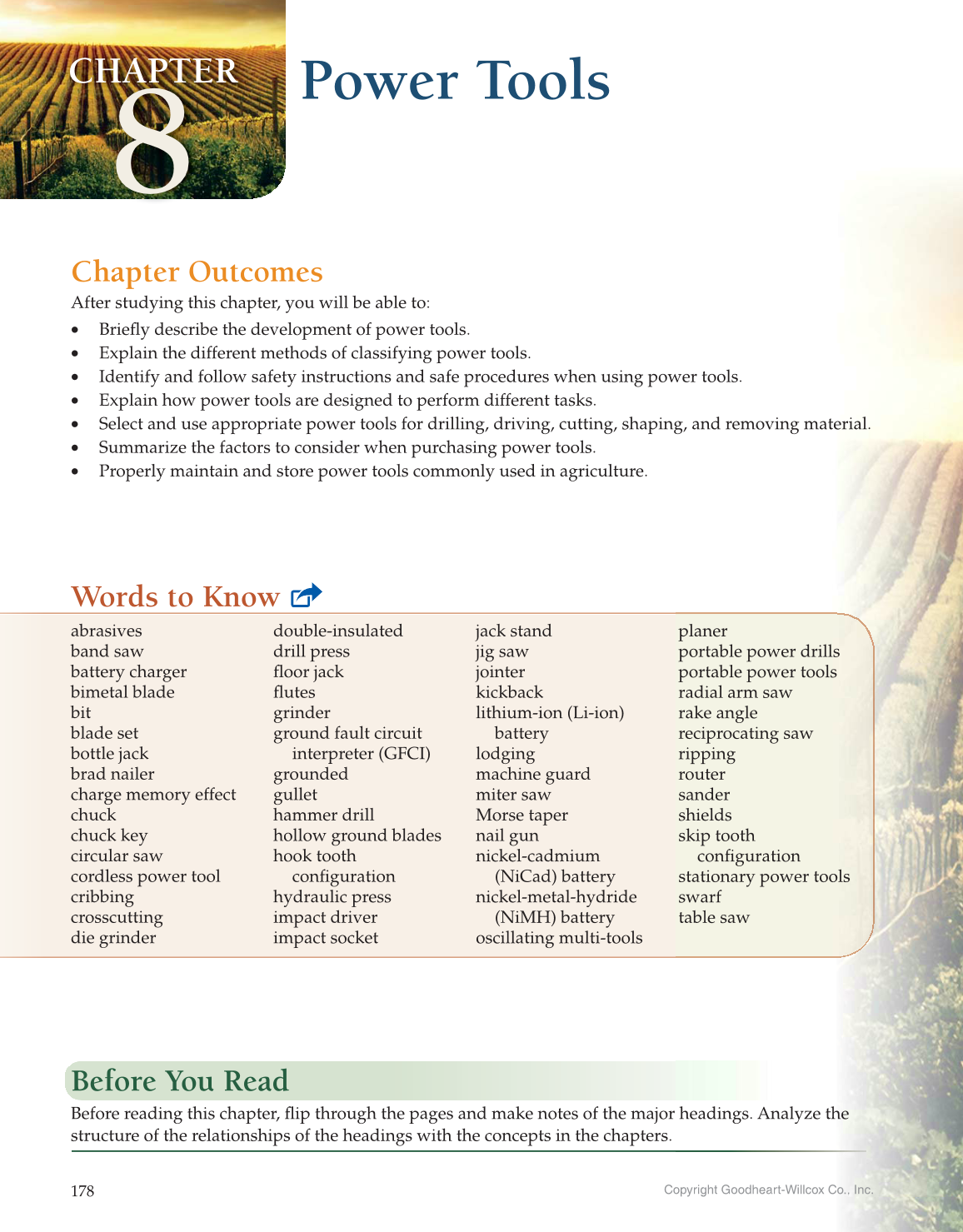 • Select and use appropriate power tools for drilling, driving, cutting, shaping, and removing material.
