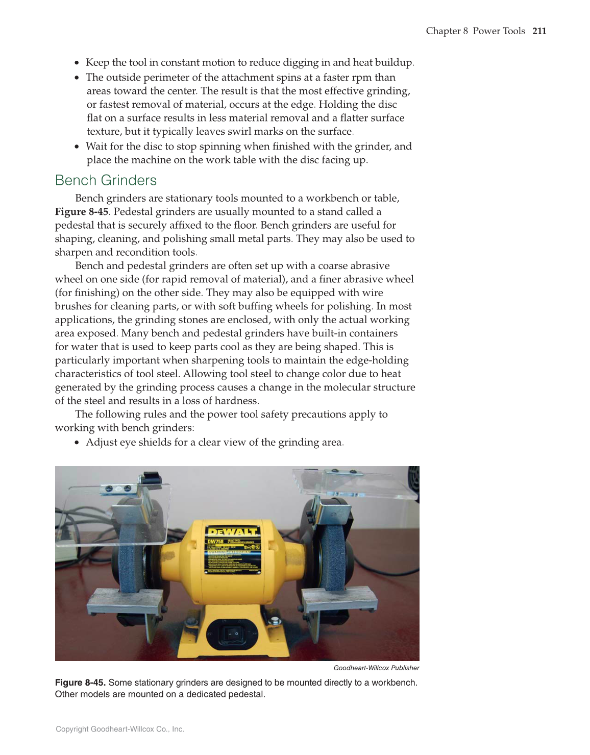 pedestal that is securely affi xed to the fl oor. Bench grinders are useful for
