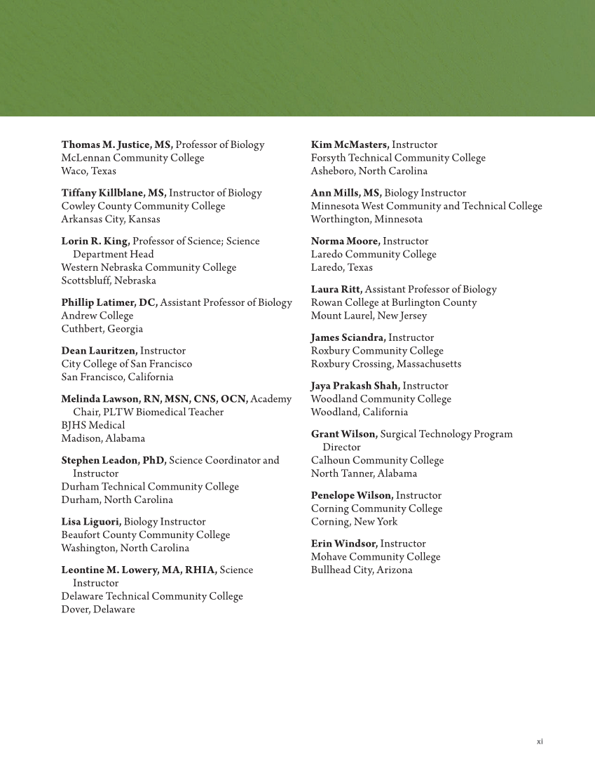 xi Thomas M. Justice, MS, Professor of Biology McLennan Community College Waco, Texas Tiffany Killblane, MS, Instructor of Biology Cowley County Community College Arkansas City, Kansas Lorin R. King, Professor of Science Science Department Head Western Nebraska Community College Scottsbluff, Nebraska Phillip Latimer, DC, Assistant Professor of Biology Andrew College Cuthbert, Georgia Dean Lauritzen, Instructor City College of San Francisco San Francisco, California Melinda Lawson, RN, MSN, CNS, OCN, Academy Chair, PLTW Biomedical Teacher BJHS Medical Madison, Alabama Stephen Leadon, PhD, Science Coordinator and Instructor Durham Technical Community College Durham, North Carolina Lisa Liguori, Biology Instructor Beaufort County Community College Washington, North Carolina Leontine M. Lowery, MA, RHIA, Science Instructor Delaware Technical Community College Dover, Delaware Kim McMasters, Instructor Forsyth Technical Community College Asheboro, North Carolina Ann Mills, MS, Biology Instructor Minnesota West Community and Technical College Worthington, Minnesota Norma Moore, Instructor Laredo Community College Laredo, Texas Laura Ritt, Assistant Professor of Biology Rowan College at Burlington County Mount Laurel, New Jersey James Sciandra, Instructor Roxbury Community College Roxbury Crossing, Massachusetts Jaya Prakash Shah, Instructor Woodland Community College Woodland, California Grant Wilson, Surgical Technology Program Director Calhoun Community College North Tanner, Alabama Penelope Wilson, Instructor Corning Community College Corning, New York Erin Windsor, Instructor Mohave Community College Bullhead City, Arizona