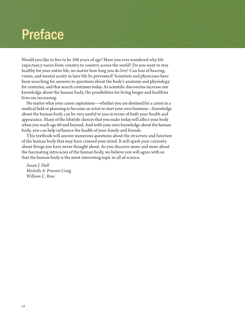 xii Would you like to live to be 100 years of age? Have you ever wondered why life expectancy varies from country to country across the world? Do you want to stay healthy for your entire life, no matter how long you do live? Can loss of hearing, vision, and mental acuity in later life be prevented? Scientists and physicians have been searching for answers to questions about the body’s anatomy and physiology for centuries, and that search continues today. As scientific discoveries increase our knowledge about the human body, the possibilities for living longer and healthier lives are increasing. No matter what your career aspirations—whether you are destined for a career in a medical field or planning to become an artist or start your own business—knowledge about the human body can be very useful to you in terms of both your health and appearance. Many of the lifestyle choices that you make today will affect your body when you reach age 60 and beyond. And with your own knowledge about the human body, you can help influence the health of your family and friends. This textbook will answer numerous questions about the structure and function of the human body that may have crossed your mind. It will spark your curiosity about things you have never thought about. As you discover more and more about the fascinating intricacies of the human body, we believe you will agree with us that the human body is the most interesting topic in all of science. Susan J. Hall Michelle A. Provost-Craig William C. Rose Preface