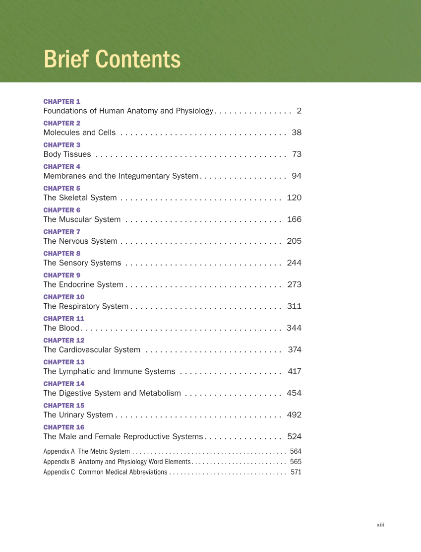 xiii CHAPTER 1 Foundations of Human Anatomy and Physiology . . . . . . . . . . . . . . . . 2 CHAPTER 2 Molecules and Cells . . . . . . . . . . . . . . . . . . . . . . . . . . . . . . . . . . . 38 CHAPTER 3 Body Tissues . . . . . . . . . . . . . . . . . . . . . . . . . . . . . . . . . . . . . . . . 73 CHAPTER 4 Membranes and the Integumentary System. . . . . . . . . . . . . . . . . . 94 CHAPTER 5 The Skeletal System . . . . . . . . . . . . . . . . . . . . . . . . . . . . . . . . . . 120 CHAPTER 6 The Muscular System . . . . . . . . . . . . . . . . . . . . . . . . . . . . . . . . . 166 CHAPTER 7 The Nervous System . . . . . . . . . . . . . . . . . . . . . . . . . . . . . . . . . . 205 CHAPTER 8 The Sensory Systems . . . . . . . . . . . . . . . . . . . . . . . . . . . . . . . . . 244 CHAPTER 9 The Endocrine System . . . . . . . . . . . . . . . . . . . . . . . . . . . . . . . . 273 CHAPTER 10 The Respiratory System . . . . . . . . . . . . . . . . . . . . . . . . . . . . . . . 311 CHAPTER 11 The Blood. . . . . . . . . . . . . . . . . . . . . . . . . . . . . . . . . . . . . . . . . 344 CHAPTER 12 The Cardiovascular System . . . . . . . . . . . . . . . . . . . . . . . . . . . . . 374 CHAPTER 13 The Lymphatic and Immune Systems . . . . . . . . . . . . . . . . . . . . . . 417 CHAPTER 14 The Digestive System and Metabolism . . . . . . . . . . . . . . . . . . . . . 454 CHAPTER 15 The Urinary System . . . . . . . . . . . . . . . . . . . . . . . . . . . . . . . . . . 492 CHAPTER 16 The Male and Female Reproductive Systems . . . . . . . . . . . . . . . . 524 Appendix A The Metric System. . . . . . . . . . . . . . . . . . . . . . . . . . . . . . . . . . . . . . . . . . . 564 Appendix B Anatomy and Physiology Word Elements. . . . . . . . . . . . . . . . . . . . . . . . . . . 565 Appendix C Common Medical Abbreviations. . . . . . . . . . . . . . . . . . . . . . . . . . . . . . . . . 571 Brief Contents