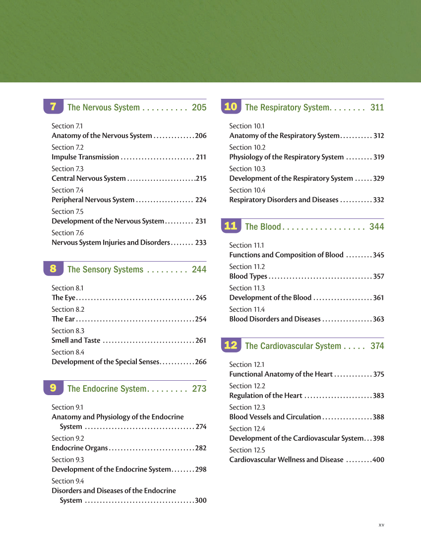 xv 7 The Nervous System. . . . . . . . . . . 205 Section 7.1 Anatomy of the Nervous System. . . . . . . . . . . . . . 206 Section 7.2 Impulse Transmission. . . . . . . . . . . . . . . . . . . . . . . . . . 211 Section 7.3 Central Nervous System. . . . . . . . . . . . . . . . . . . . . . . . 215 Section 7.4 Peripheral Nervous System. . . . . . . . . . . . . . . . . . . . . 224 Section 7.5 Development of the Nervous System. . . . . . . . . . . 231 Section 7.6 Nervous System Injuries and Disorders. . . . . . . . . 233 8 The Sensory Systems . . . . . . . . . . 244 Section 8.1 The Eye. . . . . . . . . . . . . . . . . . . . . . . . . . . . . . . . . . . . . . . . 245 Section 8.2 The Ear. . . . . . . . . . . . . . . . . . . . . . . . . . . . . . . . . . . . . . . . 254 Section 8.3 Smell and Taste . . . . . . . . . . . . . . . . . . . . . . . . . . . . . . . 261 Section 8.4 Development of the Special Senses. . . . . . . . . . . . 266 9 The Endocrine System. . . . . . . . . . 273 Section 9.1 Anatomy and Physiology of the Endocrine System . . . . . . . . . . . . . . . . . . . . . . . . . . . . . . . . . . . . . . 274 Section 9.2 Endocrine Organs. . . . . . . . . . . . . . . . . . . . . . . . . . . . . 282 Section 9.3 Development of the Endocrine System. . . . . . . . 298 Section 9.4 Disorders and Diseases of the Endocrine System . . . . . . . . . . . . . . . . . . . . . . . . . . . . . . . . . . . . . 300 10 The Respiratory System. . . . . . . . . 311 Section 10.1 Anatomy of the Respiratory System. . . . . . . . . . . . 312 Section 10.2 Physiology of the Respiratory System . . . . . . . . . . 319 Section 10.3 Development of the Respiratory System. . . . . . 329 Section 10.4 Respiratory Disorders and Diseases. . . . . . . . . . . 332 11 The Blood. . . . . . . . . . . . . . . . . . 344 Section 11.1 Functions and Composition of Blood . . . . . . . . . 345 Section 11.2 Blood Types. . . . . . . . . . . . . . . . . . . . . . . . . . . . . . . . . . . 357 Section 11.3 Development of the Blood. . . . . . . . . . . . . . . . . . . . 361 Section 11.4 Blood Disorders and Diseases. . . . . . . . . . . . . . . . . 363 12 The Cardiovascular System. . . . . . 374 Section 12.1 Functional Anatomy of the Heart. . . . . . . . . . . . . . 375 Section 12.2 Regulation of the Heart . . . . . . . . . . . . . . . . . . . . . . . 383 Section 12.3 Blood Vessels and Circulation. . . . . . . . . . . . . . . . . 388 Section 12.4 Development of the Cardiovascular System. . . 398 Section 12.5 Cardiovascular Wellness and Disease . . . . . . . . . 400