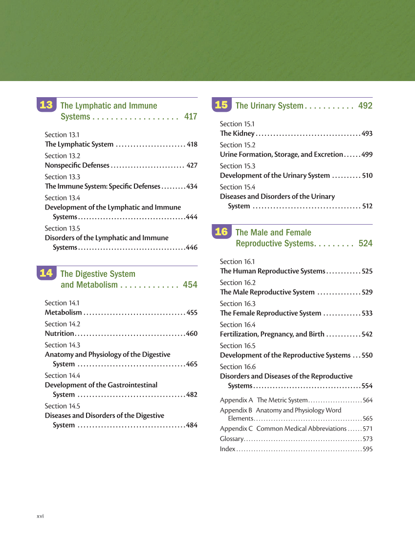 xvi 13 The Lymphatic and Immune Systems. . . . . . . . . . . . . . . . . . . . 417 Section 13.1 The Lymphatic System . . . . . . . . . . . . . . . . . . . . . . . . . 418 Section 13.2 Nonspecific Defenses. . . . . . . . . . . . . . . . . . . . . . . . . . . 427 Section 13.3 The Immune System: Specific Defenses. . . . . . . . . 434 Section 13.4 Development of the Lymphatic and Immune Systems. . . . . . . . . . . . . . . . . . . . . . . . . . . . . . . . . . . . . . . 444 Section 13.5 Disorders of the Lymphatic and Immune Systems. . . . . . . . . . . . . . . . . . . . . . . . . . . . . . . . . . . . . . . 446 14 The Digestive System and Metabolism. . . . . . . . . . . . . 454 Section 14.1 Metabolism. . . . . . . . . . . . . . . . . . . . . . . . . . . . . . . . . . . 455 Section 14.2 Nutrition. . . . . . . . . . . . . . . . . . . . . . . . . . . . . . . . . . . . . . 460 Section 14.3 Anatomy and Physiology of the Digestive System . . . . . . . . . . . . . . . . . . . . . . . . . . . . . . . . . . . . . 465 Section 14.4 Development of the Gastrointestinal System . . . . . . . . . . . . . . . . . . . . . . . . . . . . . . . . . . . . . 482 Section 14.5 Diseases and Disorders of the Digestive System . . . . . . . . . . . . . . . . . . . . . . . . . . . . . . . . . . . . . 484 15 The Urinary System. . . . . . . . . . . . 492 Section 15.1 The Kidney. . . . . . . . . . . . . . . . . . . . . . . . . . . . . . . . . . . . 493 Section 15.2 Urine Formation, Storage, and Excretion. . . . . . 499 Section 15.3 Development of the Urinary System . . . . . . . . . . . 510 Section 15.4 Diseases and Disorders of the Urinary System . . . . . . . . . . . . . . . . . . . . . . . . . . . . . . . . . . . . . . 512 16 The Male and Female Reproductive Systems. . . . . . . . . . 524 Section 16.1 The Human Reproductive Systems. . . . . . . . . . . . 525 Section 16.2 The Male Reproductive System . . . . . . . . . . . . . . . 529 Section 16.3 The Female Reproductive System . . . . . . . . . . . . . 533 Section 16.4 Fertilization, Pregnancy, and Birth. . . . . . . . . . . . 542 Section 16.5 Development of the Reproductive Systems . . . 550 Section 16.6 Disorders and Diseases of the Reproductive Systems. . . . . . . . . . . . . . . . . . . . . . . . . . . . . . . . . . . . . . . 554 Appendix A The Metric System. . . . . . . . . . . . . . . . . . . . . . 564 Appendix B Anatomy and Physiology Word Elements. . . . . . . . . . . . . . . . . . . . . . . . . . . . . . . . . . . . . . . . . . . . 565 Appendix C Common Medical Abbreviations. . . . . . 571 Glossary. . . . . . . . . . . . . . . . . . . . . . . . . . . . . . . . . . . . . . . . . . . . . . . . 573 Index. . . . . . . . . . . . . . . . . . . . . . . . . . . . . . . . . . . . . . . . . . . . . . . . . . . 595