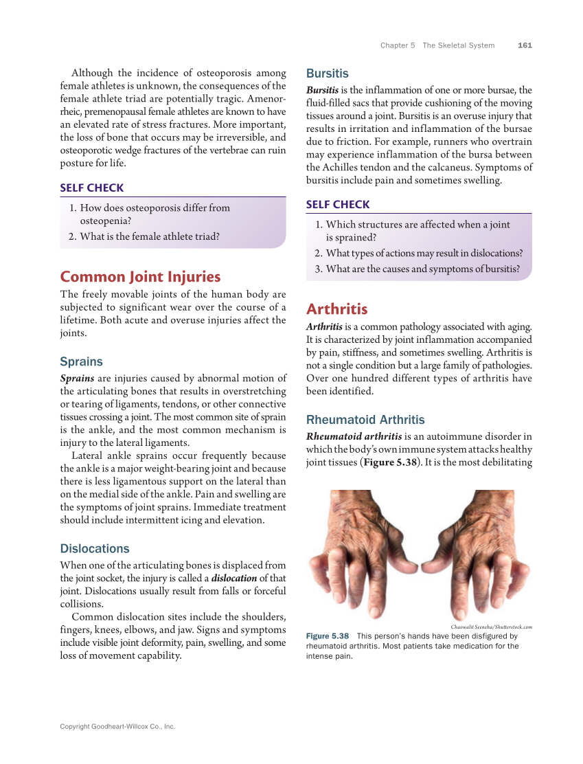 Copyright Goodheart-Willcox Co., Inc. Chapter 5 The Skeletal System 161 Bursitis Bursitis is the inflammation of one or more bursae, the fluid-filled sacs that provide cushioning of the moving tissues around a joint. Bursitis is an overuse injury that results in irritation and inflammation of the bursae due to friction. For example, runners who overtrain may experience inflammation of the bursa between the Achilles tendon and the calcaneus. Symptoms of bursitis include pain and sometimes swelling. SELF CHECK 1. Which structures are affected when a joint is sprained? 2. What types of actions may result in dislocations? 3. What are the causes and symptoms of bursitis? Arthritis Arthritis is a common pathology associated with aging. It is characterized by joint inflammation accompanied by pain, stiffness, and sometimes swelling. Arthritis is not a single condition but a large family of pathologies. Over one hundred different types of arthritis have been identified. Rheumatoid Arthritis Rheumatoid arthritis is an autoimmune disorder in which the body’s own immune system attacks healthy joint tissues (Figure 5.38). It is the most debilitating Although the incidence of osteoporosis among female athletes is unknown, the consequences of the female athlete triad are potentially tragic. Amenor- rheic, premenopausal female athletes are known to have an elevated rate of stress fractures. More important, the loss of bone that occurs may be irreversible, and osteoporotic wedge fractures of the vertebrae can ruin posture for life. SELF CHECK 1. How does osteoporosis differ from osteopenia? 2. What is the female athlete triad? Common Joint Injuries The freely movable joints of the human body are subjected to significant wear over the course of a lifetime. Both acute and overuse injuries affect the joints. Sprains Sprains are injuries caused by abnormal motion of the articulating bones that results in overstretching or tearing of ligaments, tendons, or other connective tissues crossing a joint. The most common site of sprain is the ankle, and the most common mechanism is injury to the lateral ligaments. Lateral ankle sprains occur frequently because the ankle is a major weight-bearing joint and because there is less ligamentous support on the lateral than on the medial side of the ankle. Pain and swelling are the symptoms of joint sprains. Immediate treatment should include intermittent icing and elevation. Dislocations When one of the articulating bones is displaced from the joint socket, the injury is called a dislocation of that joint. Dislocations usually result from falls or forceful collisions. Common dislocation sites include the shoulders, fingers, knees, elbows, and jaw. Signs and symptoms include visible joint deformity, pain, swelling, and some loss of movement capability. Chaowalit Seeneha/Shutterstock.com Figure 5.38 This person’s hands have been disfigured by rheumatoid arthritis. Most patients take medication for the intense pain.