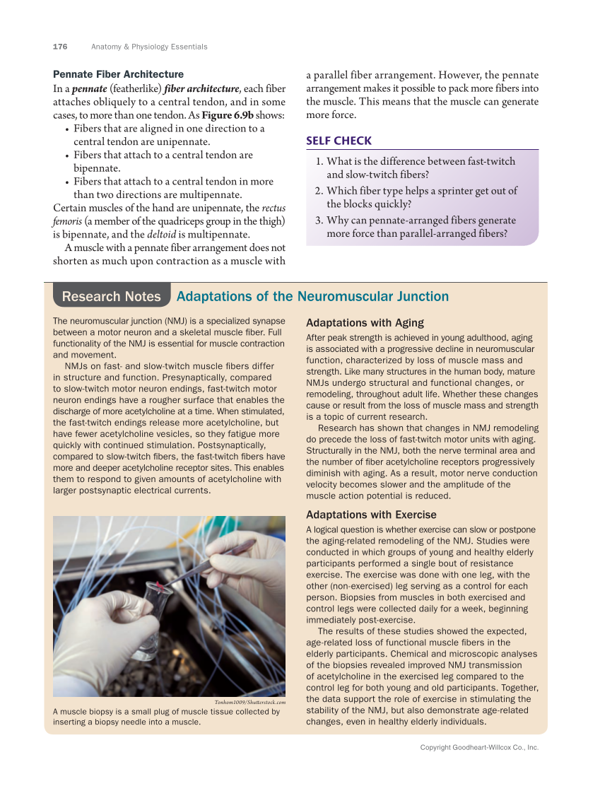 176 Anatomy & Physiology Essentials Copyright Goodheart-Willcox Co., Inc. a parallel fiber arrangement. However, the pennate arrangement makes it possible to pack more fibers into the muscle. This means that the muscle can generate more force. SELF CHECK 1. What is the difference between fast-twitch and slow-twitch fibers? 2. Which fiber type helps a sprinter get out of the blocks quickly? 3. Why can pennate-arranged fibers generate more force than parallel-arranged fibers? Pennate Fiber Architecture In a pennate (featherlike) fiber architecture, each fiber attaches obliquely to a central tendon, and in some cases, to more than one tendon. As Figure 6.9b shows: • Fibers that are aligned in one direction to a central tendon are unipennate. • Fibers that attach to a central tendon are bipennate. • Fibers that attach to a central tendon in more than two directions are multipennate. Certain muscles of the hand are unipennate, the rectus femoris (a member of the quadriceps group in the thigh) is bipennate, and the deltoid is multipennate. A muscle with a pennate fiber arrangement does not shorten as much upon contraction as a muscle with Adaptations of the Neuromuscular Junction The neuromuscular junction (NMJ) is a specialized synapse between a motor neuron and a skeletal muscle fiber. Full functionality of the NMJ is essential for muscle contraction and movement. NMJs on fast- and slow-twitch muscle fibers differ in structure and function. Presynaptically, compared to slow-twitch motor neuron endings, fast-twitch motor neuron endings have a rougher surface that enables the discharge of more acetylcholine at a time. When stimulated, the fast-twitch endings release more acetylcholine, but have fewer acetylcholine vesicles, so they fatigue more quickly with continued stimulation. Postsynaptically, compared to slow-twitch fibers, the fast-twitch fibers have more and deeper acetylcholine receptor sites. This enables them to respond to given amounts of acetylcholine with larger postsynaptic electrical currents. Adaptations with Aging After peak strength is achieved in young adulthood, aging is associated with a progressive decline in neuromuscular function, characterized by loss of muscle mass and strength. Like many structures in the human body, mature NMJs undergo structural and functional changes, or remodeling, throughout adult life. Whether these changes cause or result from the loss of muscle mass and strength is a topic of current research. Research has shown that changes in NMJ remodeling do precede the loss of fast-twitch motor units with aging. Structurally in the NMJ, both the nerve terminal area and the number of fiber acetylcholine receptors progressively diminish with aging. As a result, motor nerve conduction velocity becomes slower and the amplitude of the muscle action potential is reduced. Adaptations with Exercise A logical question is whether exercise can slow or postpone the aging-related remodeling of the NMJ. Studies were conducted in which groups of young and healthy elderly participants performed a single bout of resistance exercise. The exercise was done with one leg, with the other (non-exercised) leg serving as a control for each person. Biopsies from muscles in both exercised and control legs were collected daily for a week, beginning immediately post-exercise. The results of these studies showed the expected, age-related loss of functional muscle fibers in the elderly participants. Chemical and microscopic analyses of the biopsies revealed improved NMJ transmission of acetylcholine in the exercised leg compared to the control leg for both young and old participants. Together, the data support the role of exercise in stimulating the stability of the NMJ, but also demonstrate age-related changes, even in healthy elderly individuals. Research Notes Tonhom1009/Shutterstock.com A muscle biopsy is a small plug of muscle tissue collected by inserting a biopsy needle into a muscle.