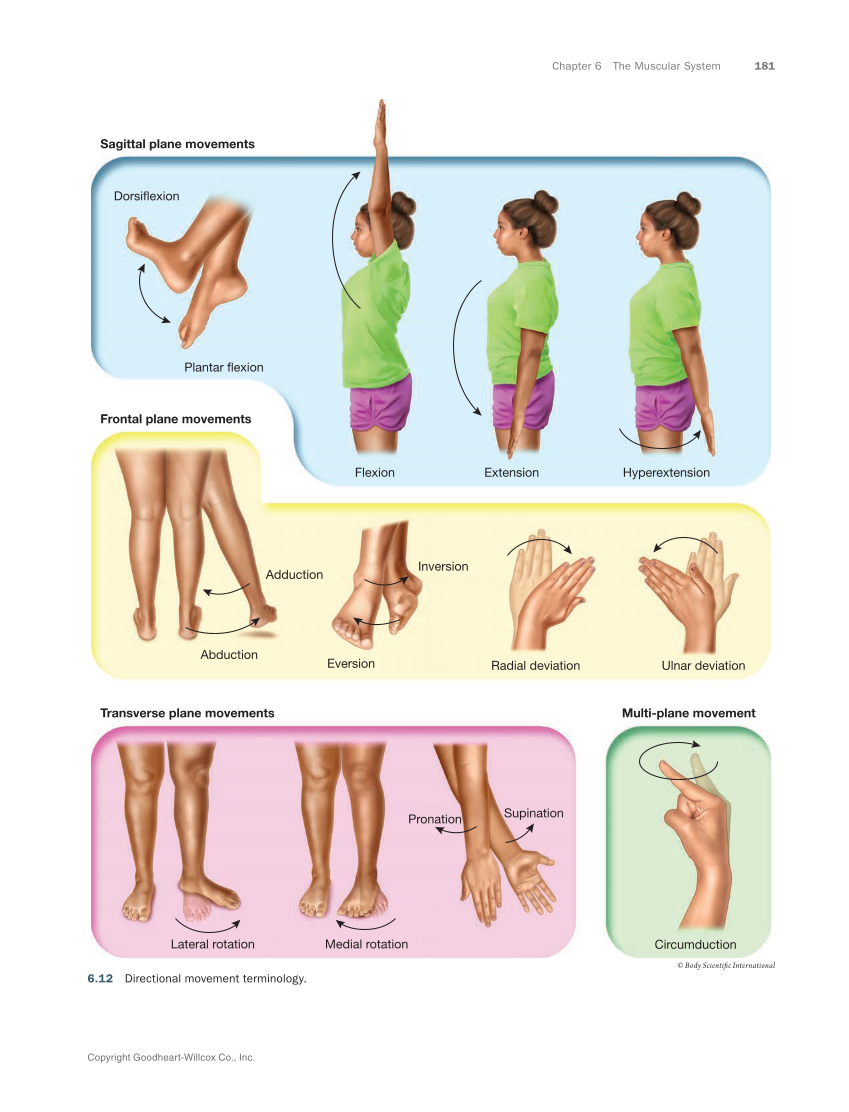 Chapter 6 The Muscular System 181 Copyright Goodheart-Willcox Co., Inc. Flexion Adduction Abduction Eversion Inversion Radial deviation Ulnar deviation Lateral rotation Medial rotation Circumduction Dorsiflexion Plantar flexion Hyperextension Extension Sagittal plane movements Frontal plane movements Transverse plane movements Multi-plane movement Pronation Supination © Body Scientific International 6.12 Directional movement terminology.