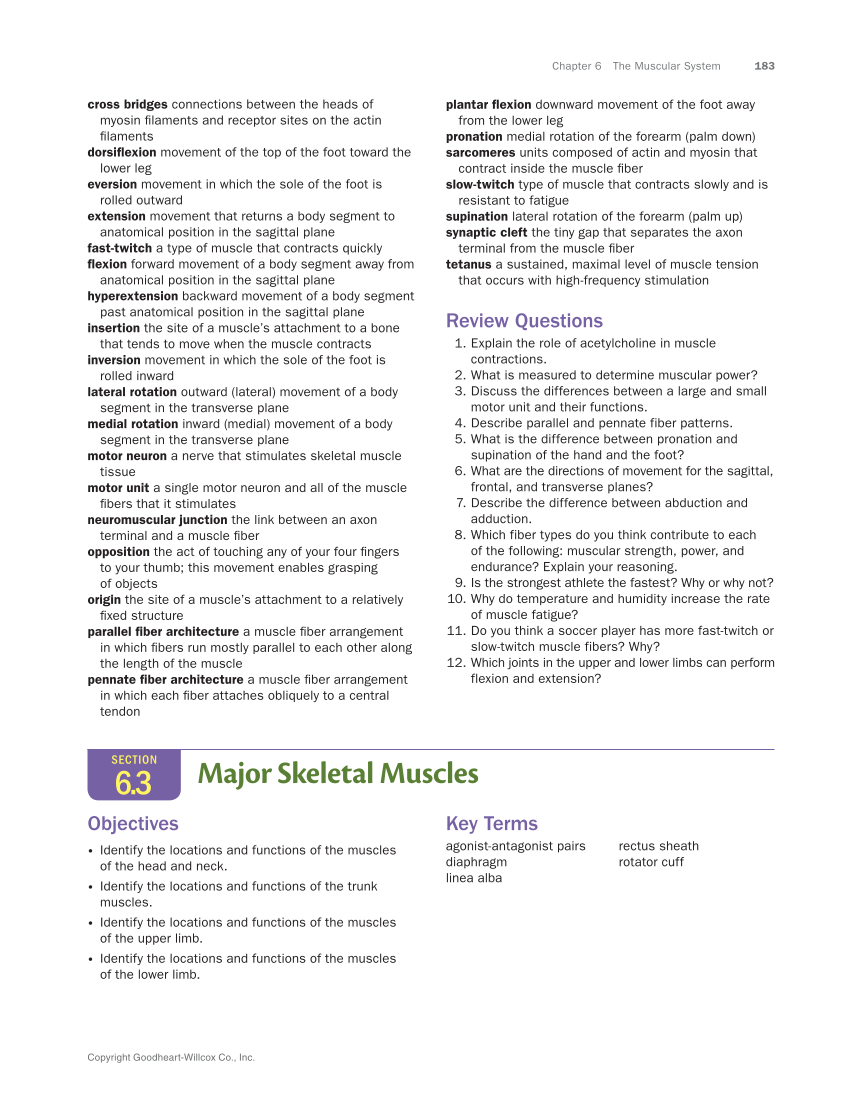 Chapter 6 The Muscular System 183 Copyright Goodheart-Willcox Co., Inc. cross bridges connections between the heads of myosin filaments and receptor sites on the actin filaments dorsiflexion movement of the top of the foot toward the lower leg eversion movement in which the sole of the foot is rolled outward extension movement that returns a body segment to anatomical position in the sagittal plane fast-twitch a type of muscle that contracts quickly flexion forward movement of a body segment away from anatomical position in the sagittal plane hyperextension backward movement of a body segment past anatomical position in the sagittal plane insertion the site of a muscle’s attachment to a bone that tends to move when the muscle contracts inversion movement in which the sole of the foot is rolled inward lateral rotation outward (lateral) movement of a body segment in the transverse plane medial rotation inward (medial) movement of a body segment in the transverse plane motor neuron a nerve that stimulates skeletal muscle tissue motor unit a single motor neuron and all of the muscle fibers that it stimulates neuromuscular junction the link between an axon terminal and a muscle fiber opposition the act of touching any of your four fingers to your thumb this movement enables grasping of objects origin the site of a muscle’s attachment to a relatively fixed structure parallel fiber architecture a muscle fiber arrangement in which fibers run mostly parallel to each other along the length of the muscle pennate fiber architecture a muscle fiber arrangement in which each fiber attaches obliquely to a central tendon plantar flexion downward movement of the foot away from the lower leg pronation medial rotation of the forearm (palm down) sarcomeres units composed of actin and myosin that contract inside the muscle fiber slow-twitch type of muscle that contracts slowly and is resistant to fatigue supination lateral rotation of the forearm (palm up) synaptic cleft the tiny gap that separates the axon terminal from the muscle fiber tetanus a sustained, maximal level of muscle tension that occurs with high-frequency stimulation Review Questions 1. Explain the role of acetylcholine in muscle contractions. 2. What is measured to determine muscular power? 3. Discuss the differences between a large and small motor unit and their functions. 4. Describe parallel and pennate fiber patterns. 5. What is the difference between pronation and supination of the hand and the foot? 6. What are the directions of movement for the sagittal, frontal, and transverse planes? 7. Describe the difference between abduction and adduction. 8. Which fiber types do you think contribute to each of the following: muscular strength, power, and endurance? Explain your reasoning. 9. Is the strongest athlete the fastest? Why or why not? 10. Why do temperature and humidity increase the rate of muscle fatigue? 11. Do you think a soccer player has more fast-twitch or slow-twitch muscle fibers? Why? 12. Which joints in the upper and lower limbs can perform flexion and extension? SECTION 6.3 Major Skeletal Muscles Objectives • Identify the locations and functions of the muscles of the head and neck. • Identify the locations and functions of the trunk muscles. • Identify the locations and functions of the muscles of the upper limb. • Identify the locations and functions of the muscles of the lower limb. Key Terms agonist-antagonist pairs diaphragm linea alba rectus sheath rotator cuff
