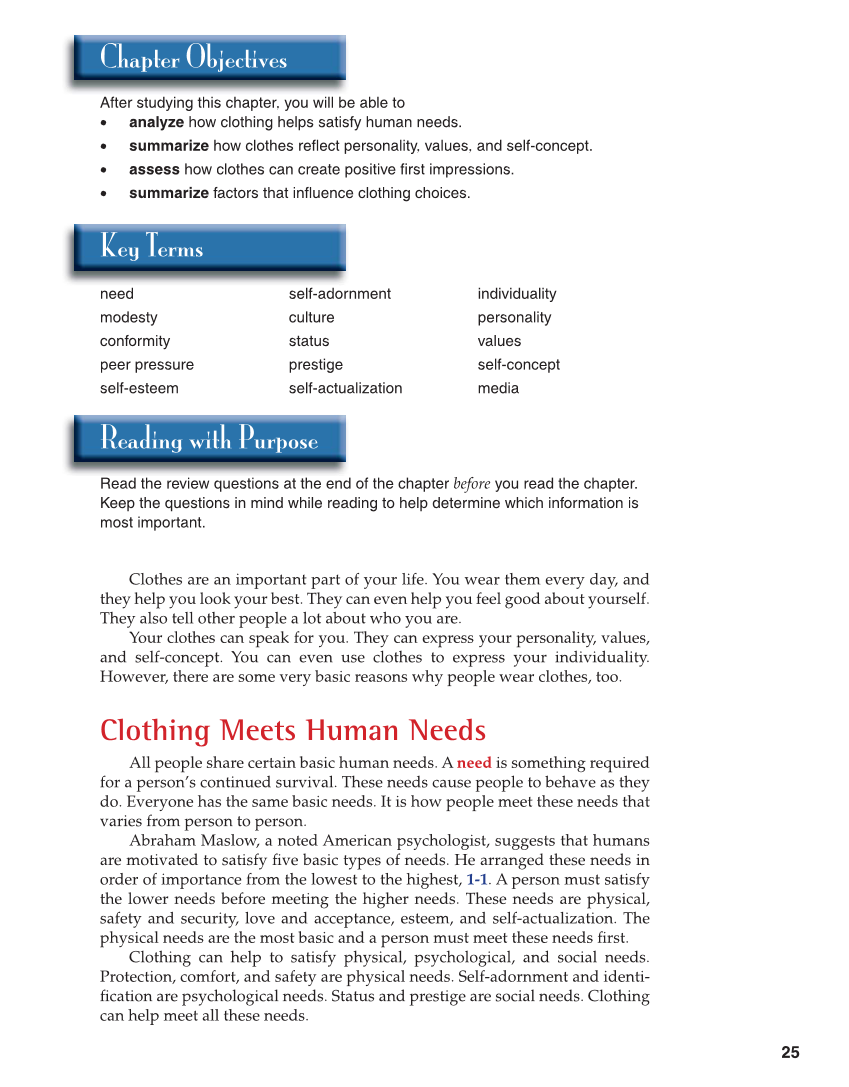 25 Reading with Purpose Read the review questions at the end of the chapter before you read the chapter. Keep the questions in mind while reading to help determine which information is most important. Clothes are an important part of your life. You wear them every day, and they help you look your best. They can even help you feel good about yourself. They also tell other people a lot about who you are. Your clothes can speak for you. They can express your personality, values, and self-concept. You can even use clothes to express your individuality. However, there are some very basic reasons why people wear clothes, too. Clothing Meets Human Needs All people share certain basic human needs. A need is something required for a person’s continued survival. These needs cause people to behave as they do. Everyone has the same basic needs. It is how people meet these needs that varies from person to person. Abraham Maslow, a noted American psychologist, suggests that humans are motivated to satisfy fi ve basic types of needs. He arranged these needs in order of importance from the lowest to the highest, 1-1. A person must satisfy the lower needs before meeting the higher needs. These needs are physical, safety and security, love and acceptance, esteem, and self-actualization. The physical needs are the most basic and a person must meet these needs fi rst. Clothing can help to satisfy physical, psychological, and social needs. Protection, comfort, and safety are physical needs. Self-adornment and identi- fi cation are psychological needs. Status and prestige are social needs. Clothing can help meet all these needs. Chapter Objectives After studying this chapter, you will be able to • analyze how clothing helps satisfy human needs. • summarize how clothes refl ect personality, values, and self-concept. • assess how clothes can create positive fi rst impressions. • summarize factors that infl uence clothing choices. Key Terms need modesty conformity peer pressure self-esteem self-adornment culture status prestige self-actualization individuality personality values self-concept media