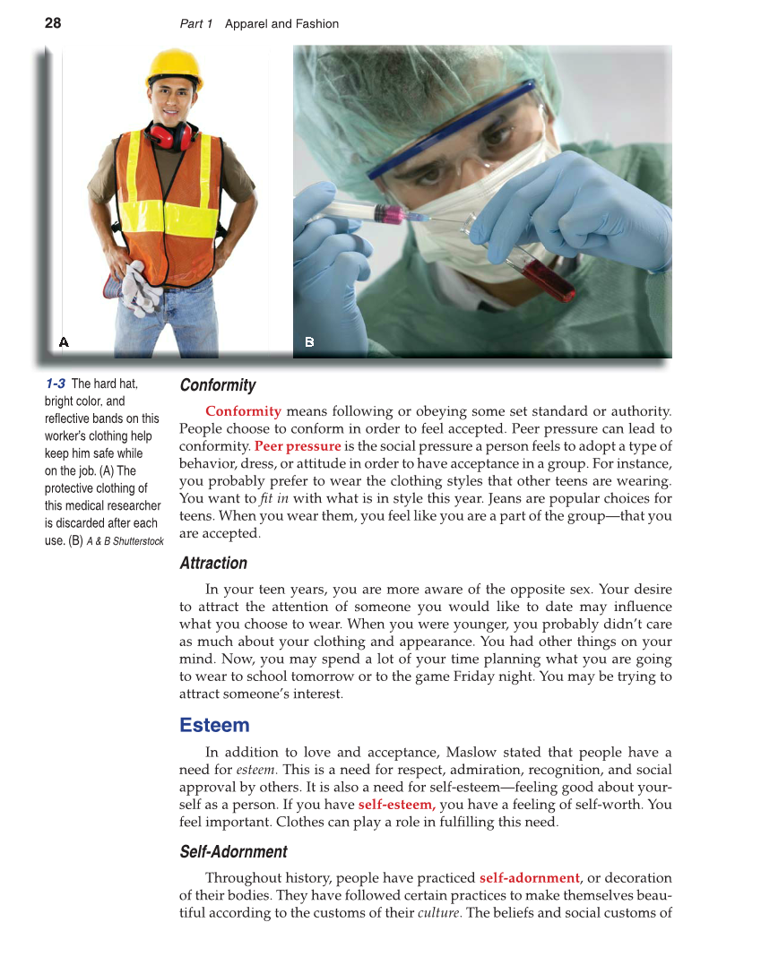 28 Part 1 Apparel and Fashion Conformity Conformity means following or obeying some set standard or authority. People choose to conform in order to feel accepted. Peer pressure can lead to conformity. Peer pressure is the social pressure a person feels to adopt a type of behavior, dress, or attitude in order to have acceptance in a group. For instance, you probably prefer to wear the clothing styles that other teens are wearing. You want to fi t in with what is in style this year. Jeans are popular choices for teens. When you wear them, you feel like you are a part of the group—that you are accepted. Attraction In your teen years, you are more aware of the opposite sex. Your desire to attract the attention of someone you would like to date may infl uence what you choose to wear. When you were younger, you probably didn’t care as much about your clothing and appearance. You had other things on your mind. Now, you may spend a lot of your time planning what you are going to wear to school tomorrow or to the game Friday night. You may be trying to attract someone’s interest. Esteem In addition to love and acceptance, Maslow stated that people have a need for esteem. This is a need for respect, admiration, recognition, and social approval by others. It is also a need for self-esteem—feeling good about your- self as a person. If you have self-esteem, you have a feeling of self-worth. You feel important. Clothes can play a role in fulfi lling this need. Self-Adornment Throughout history, people have practiced self-adornment, or decoration of their bodies. They have followed certain practices to make themselves beau- tiful according to the customs of their culture. The beliefs and social customs of 1-3 The hard hat, bright color, and refl ective bands on this worker’s clothing help keep him safe while on the job. (A) The protective clothing of this medical researcher is discarded after each use. (B) A & B Shutterstock