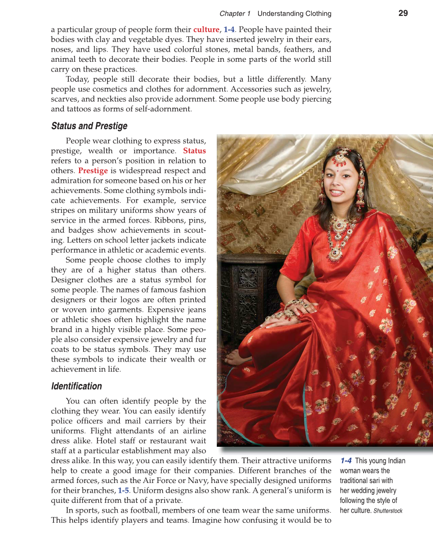 Chapter 1 Understanding Clothing 29 a particular group of people form their culture, 1-4. People have painted their bodies with clay and vegetable dyes. They have inserted jewelry in their ears, noses, and lips. They have used colorful stones, metal bands, feathers, and animal teeth to decorate their bodies. People in some parts of the world still carry on these practices. Today, people still decorate their bodies, but a little differently. Many people use cosmetics and clothes for adornment. Accessories such as jewelry, scarves, and neckties also provide adornment. Some people use body piercing and tattoos as forms of self-adornment. Status and Prestige People wear clothing to express status, prestige, wealth or importance. Status refers to a person’s position in relation to others. Prestige is widespread respect and admiration for someone based on his or her achievements. Some clothing symbols indi- cate achievements. For example, service stripes on military uniforms show years of service in the armed forces. Ribbons, pins, and badges show achievements in scout- ing. Letters on school letter jackets indicate performance in athletic or academic events. Some people choose clothes to imply they are of a higher status than others. Designer clothes are a status symbol for some people. The names of famous fashion designers or their logos are often printed or woven into garments. Expensive jeans or athletic shoes often highlight the name brand in a highly visible place. Some peo- ple also consider expensive jewelry and fur coats to be status symbols. They may use these symbols to indicate their wealth or achievement in life. Identifi cation You can often identify people by the clothing they wear. You can easily identify police offi cers and mail carriers by their uniforms. Flight attendants of an airline dress alike. Hotel staff or restaurant wait staff at a particular establishment may also dress alike. In this way, you can easily identify them. Their attractive uniforms help to create a good image for their companies. Different branches of the armed forces, such as the Air Force or Navy, have specially designed uniforms for their branches, 1-5. Uniform designs also show rank. A general’s uniform is quite different from that of a private. In sports, such as football, members of one team wear the same uniforms. This helps identify players and teams. Imagine how confusing it would be to 1-4 This young Indian woman wears the traditional sari with her wedding jewelry following the style of her culture. Shutterstock