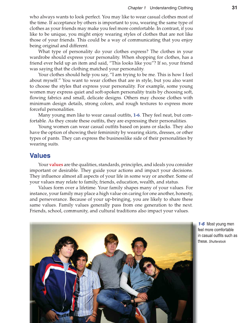 Chapter 1 Understanding Clothing 31 who always wants to look perfect. You may like to wear casual clothes most of the time. If acceptance by others is important to you, wearing the same type of clothes as your friends may make you feel more comfortable. In contrast, if you like to be unique, you might enjoy wearing styles of clothes that are not like those of your friends. This could be a way of communicating that you enjoy being original and different. What type of personality do your clothes express? The clothes in your wardrobe should express your personality. When shopping for clothes, has a friend ever held up an item and said, “This looks like you”? If so, your friend was saying that the clothing matched your personality. Your clothes should help you say, “I am trying to be me. This is how I feel about myself.” You want to wear clothes that are in style, but you also want to choose the styles that express your personality. For example, some young women may express quiet and soft-spoken personality traits by choosing soft, fl owing fabrics and small, delicate designs. Others may choose clothes with minimum design details, strong colors, and rough textures to express more forceful personalities. Many young men like to wear casual outfi ts, 1-6. They feel neat, but com- fortable. As they create these outfi ts, they are expressing their personalities. Young women can wear casual outfi ts based on jeans or slacks. They also have the option of showing their femininity by wearing skirts, dresses, or other types of pants. They can express the businesslike side of their personalities by wearing suits. Values Your values are the qualities, standards, principles, and ideals you consider important or desirable. They guide your actions and impact your decisions. They infl uence almost all aspects of your life in some way or another. Some of your values may relate to family, friends, education, wealth, and status. Values form over a lifetime. Your family shapes many of your values. For instance, your family may place a high value on caring for one another, honesty, and perseverance. Because of your up-bringing, you are likely to share these same values. Family values generally pass from one generation to the next. Friends, school, community, and cultural traditions also impact your values. 1-6 Most young men feel more comfortable in casual outfi ts such as these. Shutterstock f t