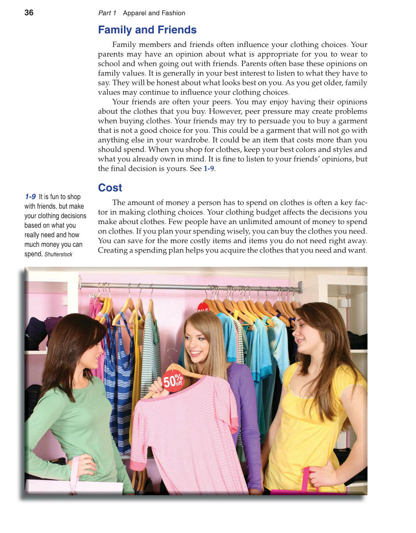 36 Part 1 Apparel and Fashion Family and Friends Family members and friends often infl uence your clothing choices. Your parents may have an opinion about what is appropriate for you to wear to school and when going out with friends. Parents often base these opinions on family values. It is generally in your best interest to listen to what they have to say. They will be honest about what looks best on you. As you get older, family values may continue to infl uence your clothing choices. Your friends are often your peers. You may enjoy having their opinions about the clothes that you buy. However, peer pressure may create problems when buying clothes. Your friends may try to persuade you to buy a garment that is not a good choice for you. This could be a garment that will not go with anything else in your wardrobe. It could be an item that costs more than you should spend. When you shop for clothes, keep your best colors and styles and what you already own in mind. It is fi ne to listen to your friends’ opinions, but the fi nal decision is yours. See 1-9. Cost The amount of money a person has to spend on clothes is often a key fac- tor in making clothing choices. Your clothing budget affects the decisions you make about clothes. Few people have an unlimited amount of money to spend on clothes. If you plan your spending wisely, you can buy the clothes you need. You can save for the more costly items and items you do not need right away. Creating a spending plan helps you acquire the clothes that you need and want. 1-9 It is fun to shop with friends, but make your clothing decisions based on what you really need and how much money you can spend. Shutterstock