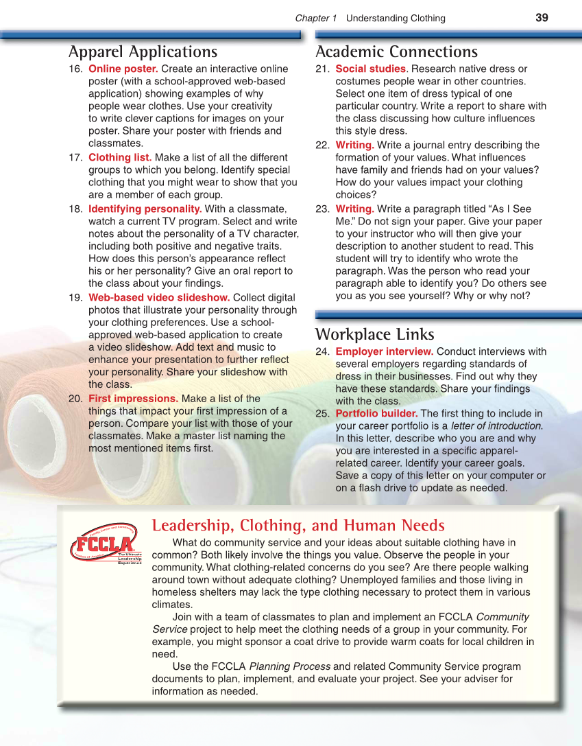 Chapter 1 Understanding Clothing 39 Leadership, Clothing, and Human Needs What do community service and your ideas about suitable clothing have in common? Both likely involve the things you value. Observe the people in your community. What clothing-related concerns do you see? Are there people walking around town without adequate clothing? Unemployed families and those living in homeless shelters may lack the type clothing necessary to protect them in various climates. Join with a team of classmates to plan and implement an FCCLA Community Service project to help meet the clothing needs of a group in your community. For example, you might sponsor a coat drive to provide warm coats for local children in need. Use the FCCLA Planning Process and related Community Service program documents to plan, implement, and evaluate your project. See your adviser for information as needed. Apparel Applications 16. Online poster. Create an interactive online poster (with a school-approved web-based application) showing examples of why people wear clothes. Use your creativity to write clever captions for images on your poster. Share your poster with friends and classmates. 17. Clothing list. Make a list of all the different groups to which you belong. Identify special clothing that you might wear to show that you are a member of each group. 18. Identifying personality. With a classmate, watch a current TV program. Select and write notes about the personality of a TV character, including both positive and negative traits. How does this person’s appearance refl ect his or her personality? Give an oral report to the class about your fi ndings. 19. Web-based video slideshow. Collect digital photos that illustrate your personality through your clothing preferences. Use a school- approved web-based application to create a video slideshow. Add text and music to enhance your presentation to further refl ect your personality. Share your slideshow with the class. 20. First impressions. Make a list of the things that impact your fi rst impression of a person. Compare your list with those of your classmates. Make a master list naming the most mentioned items fi rst. Academic Connections 21. Social studies. Research native dress or costumes people wear in other countries. Select one item of dress typical of one particular country. Write a report to share with the class discussing how culture infl uences this style dress. 22. Writing. Write a journal entry describing the formation of your values. What infl uences have family and friends had on your values? How do your values impact your clothing choices? 23. Writing. Write a paragraph titled “As I See Me.” Do not sign your paper. Give your paper to your instructor who will then give your description to another student to read. This student will try to identify who wrote the paragraph. Was the person who read your paragraph able to identify you? Do others see you as you see yourself? Why or why not? Workplace Links 24. Employer interview. Conduct interviews with several employers regarding standards of dress in their businesses. Find out why they have these standards. Share your fi ndings with the class. 25. Portfolio builder. The fi rst thing to include in your career portfolio is a letter of introduction. In this letter, describe who you are and why you are interested in a specifi c apparel- related career. Identify your career goals. Save a copy of this letter on your computer or on a fl ash drive to update as needed. A d i C ti