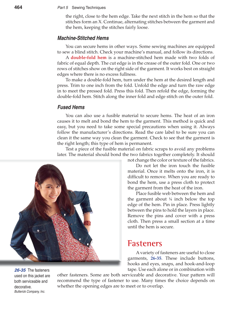 464 Part 5 Sewing Techniques the right, close to the hem edge. Take the next stitch in the hem so that the stitches form an X. Continue, alternating stitches between the garment and the hem, keeping the stitches fairly loose. Machine-Stitched Hems You can secure hems in other ways. Some sewing machines are equipped to sew a blind stitch. Check your machine’s manual, and follow its directions. A double-fold hem is a machine-stitched hem made with two folds of fabric of equal depth. The cut edge is in the crease of the outer fold. One or two rows of stitches show on the right side of the garment. It works best on straight edges where there is no excess fullness. To make a double-fold hem, turn under the hem at the desired length and press. Trim to one inch from the fold. Unfold the edge and turn the raw edge in to meet the pressed fold. Press this fold. Then refold the edge, forming the double-fold hem. Stitch along the inner fold and edge stitch on the outer fold. Fused Hems You can also use a fusible material to secure hems. The heat of an iron causes it to melt and bond the hem to the garment. This method is quick and easy, but you need to take some special precautions when using it. Always follow the manufacturer’s directions. Read the care label to be sure you can clean it the same way you clean the garment. Check to see that the garment is the right length this type of hem is permanent. Test a piece of the fusible material on fabric scraps to avoid any problems later. The material should bond the two fabrics together completely. It should not change the color or texture of the fabrics. Do not let the iron touch the fusible material. Once it melts onto the iron, it is diffi cult to remove. When you are ready to bond the hem, use a press cloth to protect the garment from the heat of the iron. Place fusible web between the hem and the garment about ¼ inch below the top edge of the hem. Pin in place. Press lightly between the pins to hold the layers in place. Remove the pins and cover with a press cloth. Then press a small section at a time until the hem is secure. Fasteners A variety of fasteners are useful to close garments, 26-35. These include buttons, hooks and eyes, snaps, and hook-and-loop tape. Use each alone or in combination with other fasteners. Some are both serviceable and decorative. Your pattern will recommend the type of fastener to use. Many times the choice depends on whether the opening edges are to meet or to overlap. 26-35 The fasteners used on this jacket are both serviceable and decorative. Butterick Company, Inc.