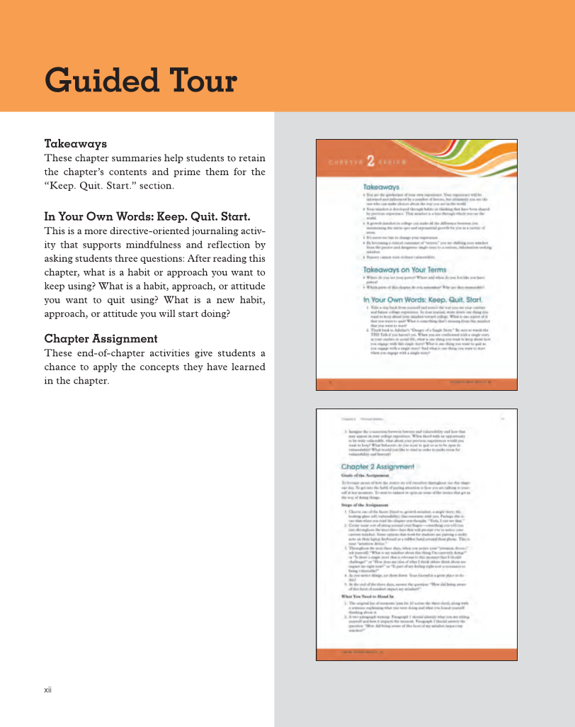 xii Takeaways These chapter summaries help students to retain the chapter’s contents and prime them for the “Keep. Quit. Start.” section. In Your Own Words: Keep. Quit. Start. This is a more directive-oriented journaling activ- ity that supports mindfulness and reflection by asking students three questions: After reading this chapter, what is a habit or approach you want to keep using? What is a habit, approach, or attitude you want to quit using? What is a new habit, approach, or attitude you will start doing? Chapter Assignment These end-of-chapter activities give students a chance to apply the concepts they have learned in the chapter. Guided Tour