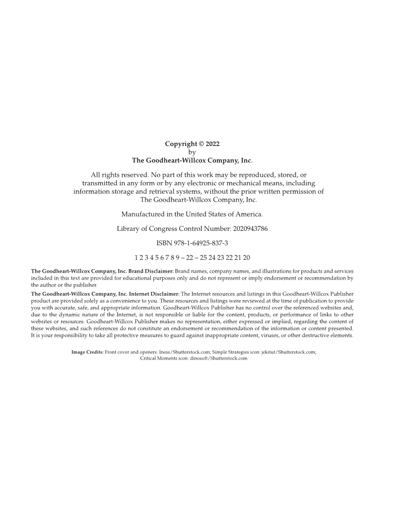 Copyright © 2022 by The Goodheart-Willcox Company, Inc. All rights reserved. No part of this work may be reproduced, stored, or transmitted in any form or by any electronic or mechanical means, including information storage and retrieval systems, without the prior written permission of The Goodheart-Willcox Company, Inc. Manufactured in the United States of America. Library of Congress Control Number: 2020943786 ISBN 978-1-64925-837-3 1 2 3 4 5 6 7 8 9 – 22 – 25 24 23 22 21 20 The Goodheart-Willcox Company, Inc. Brand Disclaimer: Brand names, company names, and illustrations for products and services included in this text are provided for educational purposes only and do not represent or imply endorsement or recommendation by the author or the publisher. The Goodheart-Willcox Company, Inc. Internet Disclaimer: The Internet resources and listings in this Goodheart-Willcox Publisher product are provided solely as a convenience to you. These resources and listings were reviewed at the time of publication to provide you with accurate, safe, and appropriate information. Goodheart-Willcox Publisher has no control over the referenced websites and, due to the dynamic nature of the Internet, is not responsible or liable for the content, products, or performance of links to other websites or resources. Goodheart-Willcox Publisher makes no representation, either expressed or implied, regarding the content of these websites, and such references do not constitute an endorsement or recommendation of the information or content presented. It is your responsibility to take all protective measures to guard against inappropriate content, viruses, or other destructive elements. Image Credits: Front cover and openers: Iness/Shutterstock.com Simple Strategies icon: jekitut/Shutterstock.com Critical Moments icon: dinosoft/Shutterstock.com
