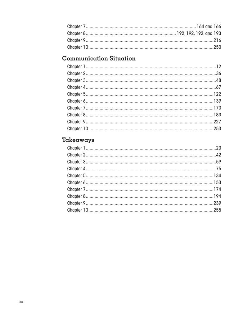 xx Chapter 7.........................................................................................164 and 166 Chapter 8......................................................................... 192, 192, 192, and 193 Chapter 9.......................................................................................................216 Chapter 10.....................................................................................................250 Communication Situation Chapter 1.........................................................................................................12 Chapter 2.........................................................................................................36 Chapter 3.........................................................................................................48 Chapter 4.........................................................................................................67 Chapter 5.......................................................................................................122 Chapter 6.......................................................................................................139 Chapter 7.......................................................................................................170 Chapter 8.......................................................................................................183 Chapter 9.......................................................................................................227 Chapter 10.....................................................................................................253 Takeaways Chapter 1.........................................................................................................20 Chapter 2.........................................................................................................42 Chapter 3.........................................................................................................59 Chapter 4.........................................................................................................75 Chapter 5.......................................................................................................134 Chapter 6.......................................................................................................153 Chapter 7.......................................................................................................174 Chapter 8.......................................................................................................194 Chapter 9.......................................................................................................239 Chapter 10.....................................................................................................255