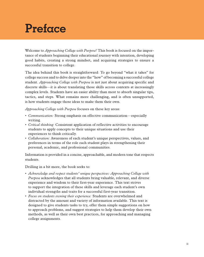 iii Welcome to Approaching College with Purpose! This book is focused on the impor- tance of students beginning their educational journey with intention, developing good habits, creating a strong mindset, and acquiring strategies to ensure a successful transition to college. The idea behind this book is straightforward: To go beyond “what it takes” for college success and to delve deeper into the “how” of becoming a successful college student. Approaching College with Purpose is not just about acquiring specific and discrete skills—it is about translating those skills across contexts at increasingly complex levels. Students have an easier ability than most to absorb singular tips, tactics, and steps. What remains more challenging, and is often unsupported, is how students engage those ideas to make them their own. Approaching College with Purpose focuses on these key areas: • Communication: Strong emphasis on effective communication—especially writing. • Critical thinking: Consistent application of reflective activities to encourage students to apply concepts to their unique situations and use their experiences to think critically. • Collaboration: Awareness of each student’s unique perspectives, values, and preferences in terms of the role each student plays in strengthening their personal, academic, and professional communities. Information is provided in a concise, approachable, and modern tone that respects students. Drilling in a bit more, the book seeks to: • Acknowledge and respect students’ unique perspectives: Approaching College with Purpose acknowledges that all students bring valuable, relevant, and diverse experience and wisdom to their first-year experience. This text strives to support the integration of these skills and leverage each student’s own individual strengths and traits for a successful first-year transition. • Focus on students owning their experience: Students are overwhelmed and distracted by the amount and variety of information available. This text is designed to give students tasks to try, offer them simple suggestions on how to approach problems, and suggest strategies to help them develop their own methods, as well as their own best practices, for approaching and managing college assignments. Preface