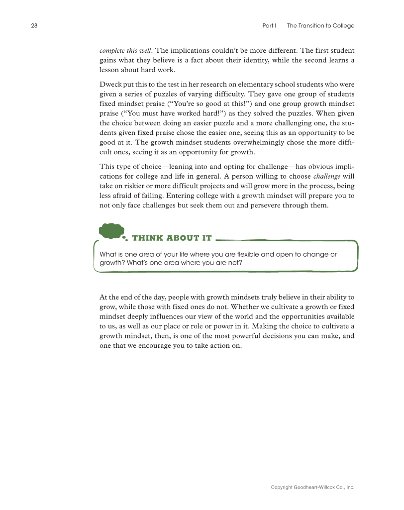 28 Part I The Transition to College Copyright Goodheart-Willcox Co., Inc. complete this well. The implications couldn’t be more different. The first student gains what they believe is a fact about their identity, while the second learns a lesson about hard work. Dweck put this to the test in her research on elementary school students who were given a series of puzzles of varying difficulty. They gave one group of students fixed mindset praise (“You’re so good at this!”) and one group growth mindset praise (“You must have worked hard!”) as they solved the puzzles. When given the choice between doing an easier puzzle and a more challenging one, the stu- dents given fixed praise chose the easier one, seeing this as an opportunity to be good at it. The growth mindset students overwhelmingly chose the more diffi- cult ones, seeing it as an opportunity for growth. This type of choice—leaning into and opting for challenge—has obvious impli- cations for college and life in general. A person willing to choose challenge will take on riskier or more difficult projects and will grow more in the process, being less afraid of failing. Entering college with a growth mindset will prepare you to not only face challenges but seek them out and persevere through them. At the end of the day, people with growth mindsets truly believe in their ability to grow, while those with fixed ones do not. Whether we cultivate a growth or fixed mindset deeply influences our view of the world and the opportunities available to us, as well as our place or role or power in it. Making the choice to cultivate a growth mindset, then, is one of the most powerful decisions you can make, and one that we encourage you to take action on. THINK ABOUT IT What is one area of your life where you are flexible and open to change or growth? What’s one area where you are not?