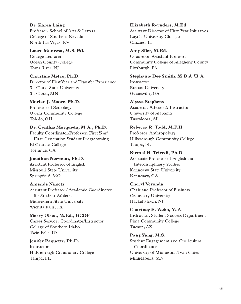 vii Dr. Karen Laing Professor, School of Arts & Letters College of Southern Nevada North Las Vegas, NV Laura Manresa, M.S. Ed. College Lecturer Ocean County College Toms River, NJ Christine Metzo, Ph.D. Director of First Year and Transfer Experience St. Cloud State University St. Cloud, MN Marian J. Moore, Ph.D. Professor of Sociology Owens Community College Toledo, OH Dr. Cynthia Mosqueda, M.A., Ph.D. Faculty Coordinator/Professor, First Year/ First-Generation Student Programming El Camino College Torrance, CA Jonathan Newman, Ph.D. Assistant Professor of English Missouri State University Springfield, MO Amanda Nimetz Assistant Professor / Academic Coordinator for Student-Athletes Midwestern State University Wichita Falls, TX Merry Olson, M.Ed., GCDF Career Services Coordinator/Instructor College of Southern Idaho Twin Falls, ID Jenifer Paquette, Ph.D. Instructor Hillsborough Community College Tampa, FL Elizabeth Reynders, M.Ed. Assistant Director of First-Year Initiatives Loyola University Chicago Chicago, IL Amy Siler, M.Ed. Counselor, Assistant Professor Community College of Allegheny County Pittsburgh, PA Stephanie Dee Smith, M.B.A./B.A. Instructor Brenau University Gainesville, GA Alyssa Stephens Academic Advisor & Instructor University of Alabama Tuscaloosa, AL Rebecca R. Todd, M.P.H. Professor, Anthropology Hillsborough Community College Tampa, FL Nirmal H. Trivedi, Ph.D. Associate Professor of English and Interdisciplinary Studies Kennesaw State University Kennesaw, GA Cheryl Veronda Chair and Professor of Business Centenary University Hackettstown, NJ Courtney E. Webb, M.A. Instructor, Student Success Department Pima Community College Tucson, AZ Pang Yang, M.S. Student Engagement and Curriculum Coordinator University of Minnesota, Twin Cities Minneapolis, MN