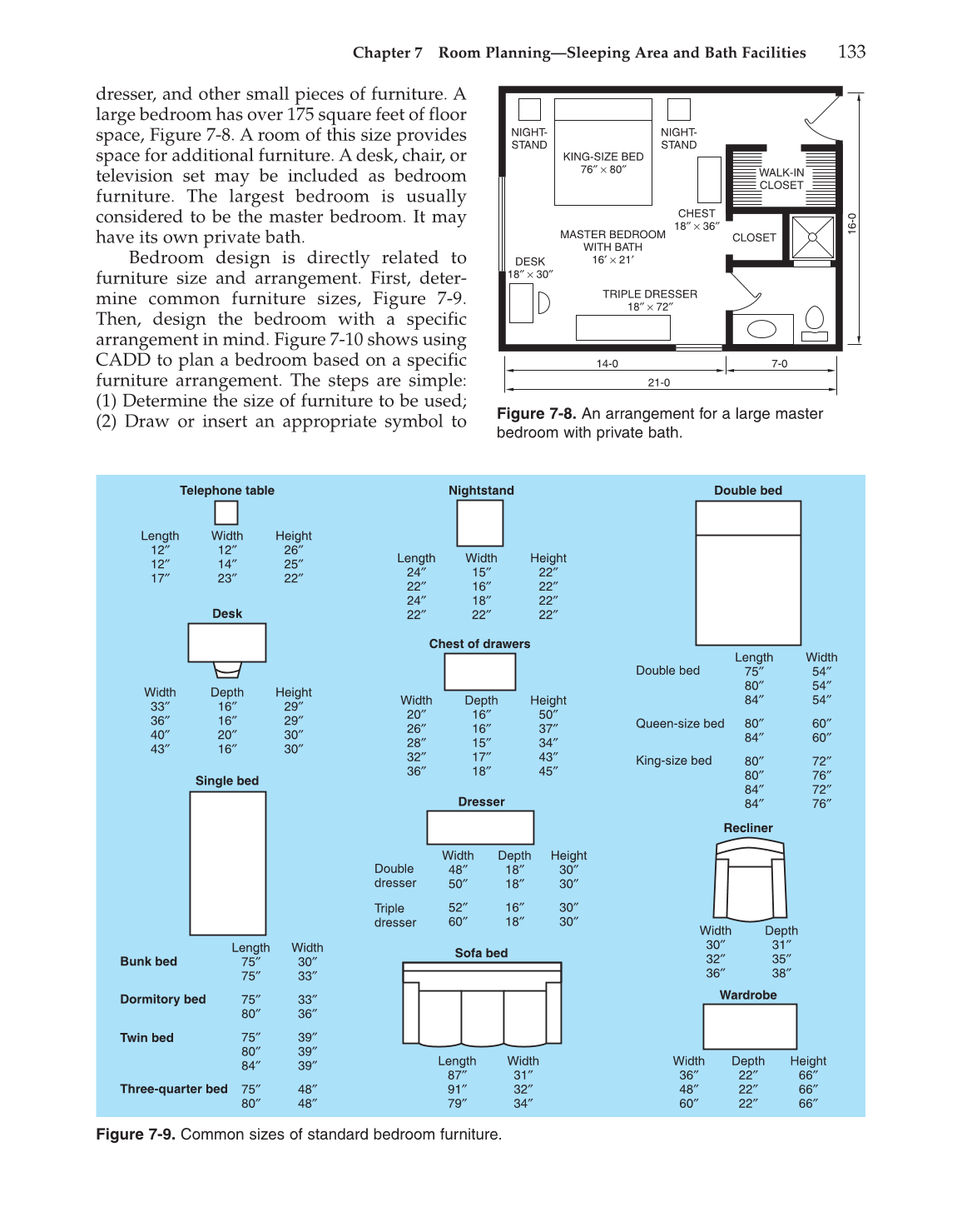 Figure 7-9. Common sizes of standard bedroom furniture.