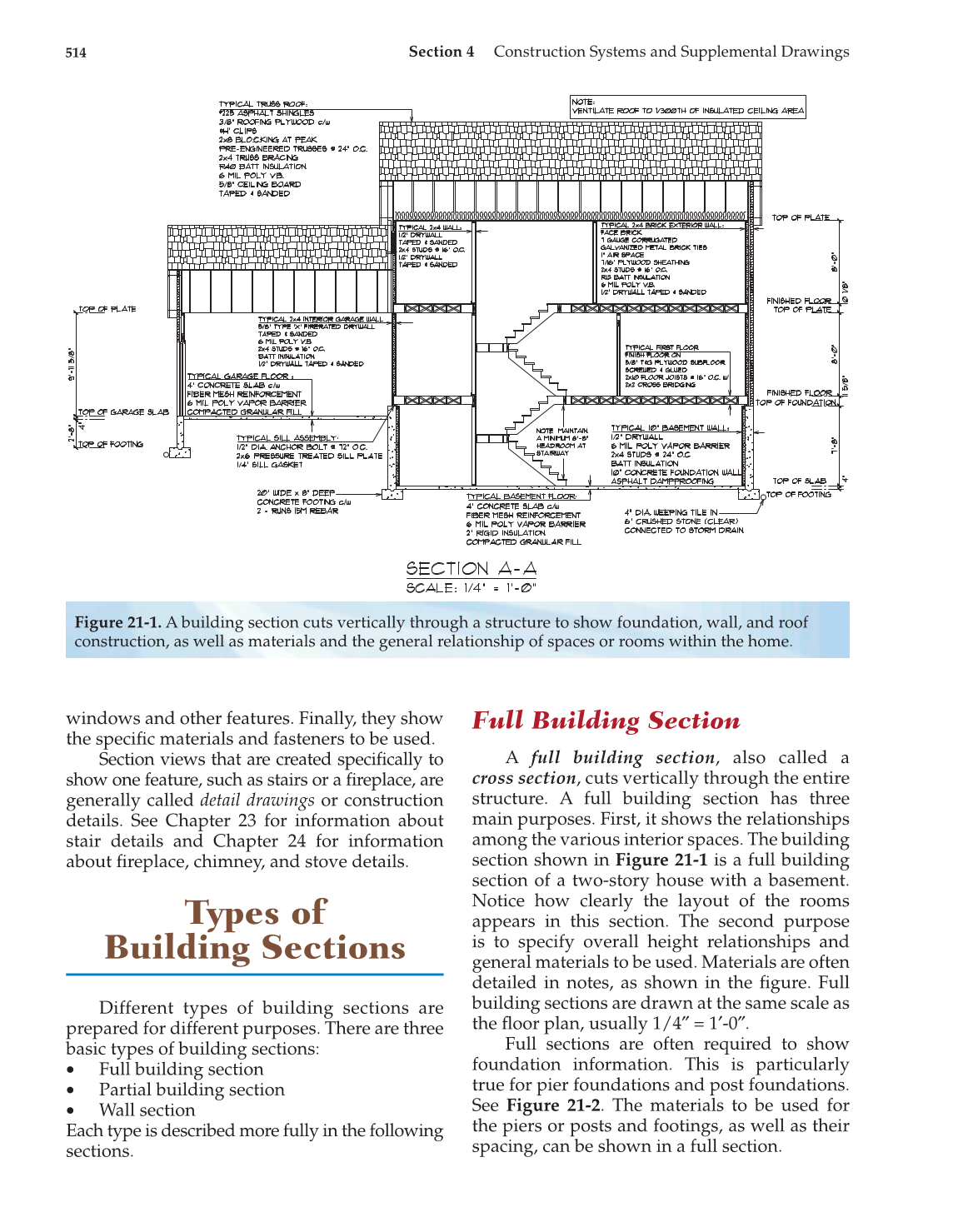 Figure 21-1. A building section cuts vertically through a structure to show foundation, wall, and roof