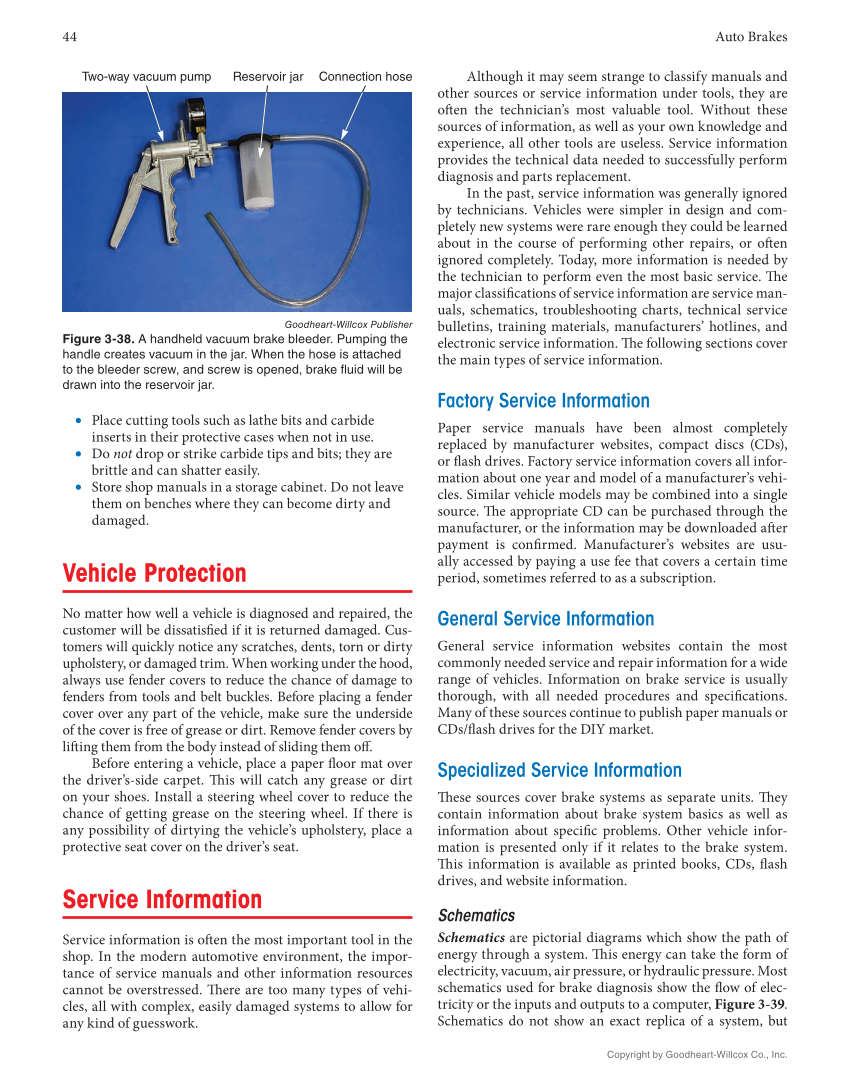 44 Auto Brakes Copyright by Goodheart-Willcox Co., Inc. • Place cutting tools such as lathe bits and carbide inserts in their protective cases when not in use. • Do not drop or strike carbide tips and bits they are brittle and can shatter easily. • Store shop manuals in a storage cabinet. Do not leave them on benches where they can become dirty and damaged. Vehicle Protection No matter how well a vehicle is diagnosed and repaired, the customer will be dissatisfi ed if it is returned damaged. Cus- tomers will quickly notice any scratches, dents, torn or dirty upholstery, or damaged trim. When working under the hood, always use fender covers to reduce the chance of damage to fenders from tools and belt buckles. Before placing a fender cover over any part of the vehicle, make sure the underside of the cover is free of grease or dirt. Remove fender covers by lift ing them from the body instead of sliding them off . Before entering a vehicle, place a paper fl oor mat over the driver’s-side carpet. Th is will catch any grease or dirt on your shoes. Install a steering wheel cover to reduce the chance of getting grease on the steering wheel. If there is any possibility of dirtying the vehicle’s upholstery, place a protective seat cover on the driver’s seat. Service Information Service information is oft en the most important tool in the shop. In the modern automotive environment, the impor- tance of service manuals and other information resources cannot be overstressed. Th ere are too many types of vehi- cles, all with complex, easily damaged systems to allow for any kind of guesswork. Although it may seem strange to classify manuals and other sources or service information under tools, they are oft en the technician’s most valuable tool. Without these sources of information, as well as your own knowledge and experience, all other tools are useless. Service information provides the technical data needed to successfully perform diagnosis and parts replacement. In the past, service information was generally ignored by technicians. Vehicles were simpler in design and com- pletely new systems were rare enough they could be learned about in the course of performing other repairs, or oft en ignored completely. Today, more information is needed by the technician to perform even the most basic service. Th e major classifi cations of service information are service man- uals, schematics, troubleshooting charts, technical service bulletins, training materials, manufacturers’ hotlines, and electronic service information. Th e following sections cover the main types of service information. Factory Service Information Paper service manuals have been almost completely replaced by manufacturer websites, compact discs (CDs), or fl ash drives. Factory service information covers all infor- mation about one year and model of a manufacturer’s vehi- cles. Similar vehicle models may be combined into a single source. Th e appropriate CD can be purchased through the manufacturer, or the information may be downloaded aft er payment is confi rmed. Manufacturer’s websites are usu- ally accessed by paying a use fee that covers a certain time period, sometimes referred to as a subscription. General Service Information General service information websites contain the most commonly needed service and repair information for a wide range of vehicles. Information on brake service is usually thorough, with all needed procedures and specifi cations. Many of these sources continue to publish paper manuals or CDs/fl ash drives for the DIY market. Specialized Service Information Th ese sources cover brake systems as separate units. Th ey contain information about brake system basics as well as information about specifi c problems. Other vehicle infor- mation is presented only if it relates to the brake system. Th is information is available as printed books, CDs, fl ash drives, and website information. Schematics Schematics are pictorial diagrams which show the path of energy through a system. Th is energy can take the form of electricity, vacuum, air pressure, or hydraulic pressure. Most schematics used for brake diagnosis show the fl ow of elec- tricity or the inputs and outputs to a computer, Figure 3-39. Schematics do not show an exact replica of a system, but Two-way vacuum pump Reservoir jar Connection hose Goodheart-Willcox Publisher Figure 3-38. A handheld vacuum brake bleeder. Pumping the handle creates vacuum in the jar. When the hose is attached to the bleeder screw, and screw is opened, brake fluid will be drawn into the reservoir jar.