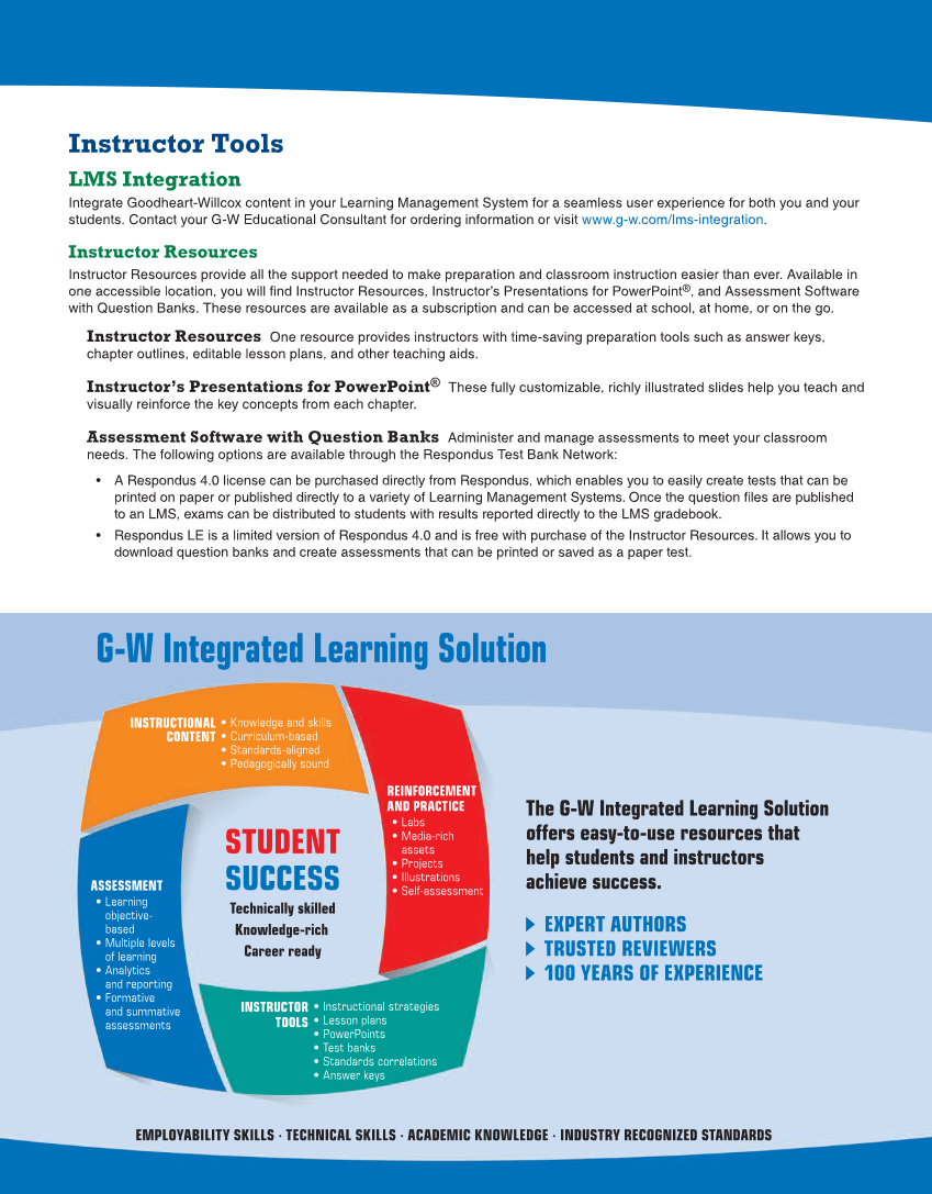 Instructor Tools LMS Integration Integrate Goodheart-Willcox content in your Learning Management System for a seamless user experience for both you and your students. Contact your G-W Educational Consultant for ordering information or visit www.g-w.com/lms-integration. Instructor Resources Instructor Resources provide all the support needed to make preparation and classroom instruction easier than ever. Available in one accessible location, you will find Instructor Resources, Instructor’s Presentations for PowerPoint®, and Assessment Software with Question Banks. These resources are available as a subscription and can be accessed at school, at home, or on the go. Instructor Resources One resource provides instructors with time-saving preparation tools such as answer keys, chapter outlines, editable lesson plans, and other teaching aids. Instructor’s Presentations for PowerPoint® These fully customizable, richly illustrated slides help you teach and visually reinforce the key concepts from each chapter. Assessment Software with Question Banks Administer and manage assessments to meet your classroom needs. The following options are available through the Respondus Test Bank Network: • A Respondus 4.0 license can be purchased directly from Respondus, which enables you to easily create tests that can be printed on paper or published directly to a variety of Learning Management Systems. Once the question files are published to an LMS, exams can be distributed to students with results reported directly to the LMS gradebook. • Respondus LE is a limited version of Respondus 4.0 and is free with purchase of the Instructor Resources. It allows you to download question banks and create assessments that can be printed or saved as a paper test. EMPLOYABILITY SKILLS ∙ TECHNICAL SKILLS ∙ ACADEMIC KNOWLEDGE ∙ INDUSTRY RECOGNIZED STANDARDS The G-W Integrated Learning Solution offers easy-to-use resources that help students and instructors achieve success. EXPERT AUTHORS TRUSTED REVIEWERS 100 YEARS OF EXPERIENCE G-W Integrated Learning Solution ASSESSMENT • Learning objective- based • Multiple levels of learning • Analytics and reporting • Formative and summative assessments • Knowledge and skills • Curriculum-based • Standards-aligned • Pedagogically sound INSTRUCTIONAL CONTENT INSTRUCTOR TOOLS • Instructional strategies • Lesson plans • PowerPoints • Test banks • Standards correlations • Answer keys REINFORCEMENT AND PRACTICE • Labs • Media-rich assets • Projects • Illustrations • Self-assessment STUDENT SUCCESS Technically skilled Knowledge-rich Career ready