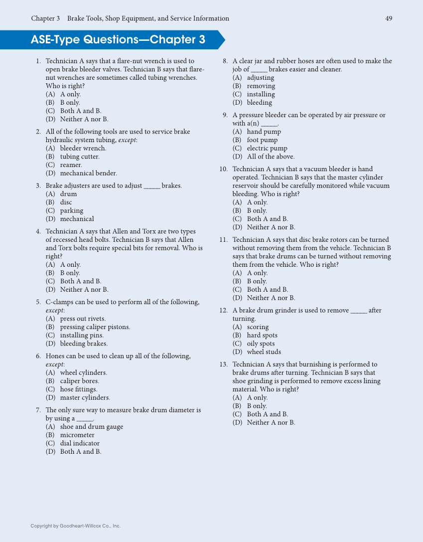 Chapter 3 Brake Tools, Shop Equipment, and Service Information 49 Copyright by Goodheart-Willcox Co., Inc. 1. Technician A says that a fl are-nut wrench is used to open brake bleeder valves. Technician B says that fl are- nut wrenches are sometimes called tubing wrenches. Who is right? (A) A only. (B) B only. (C) Both A and B. (D) Neither A nor B. 2. All of the following tools are used to service brake hydraulic system tubing, except: (A) bleeder wrench. (B) tubing cutter. (C) reamer. (D) mechanical bender. 3. Brake adjusters are used to adjust _____ brakes. (A) drum (B) disc (C) parking (D) mechanical 4. Technician A says that Allen and Torx are two types of recessed head bolts. Technician B says that Allen and Torx bolts require special bits for removal. Who is right? (A) A only. (B) B only. (C) Both A and B. (D) Neither A nor B. 5. C-clamps can be used to perform all of the following, except: (A) press out rivets. (B) pressing caliper pistons. (C) installing pins. (D) bleeding brakes. 6. Hones can be used to clean up all of the following, except: (A) wheel cylinders. (B) caliper bores. (C) hose fi ttings. (D) master cylinders. 7. Th e only sure way to measure brake drum diameter is by using a _____. (A) shoe and drum gauge (B) micrometer (C) dial indicator (D) Both A and B. ASE-Type Questions—Chapter 3 8. A clear jar and rubber hoses are oft en used to make the job of _____ brakes easier and cleaner. (A) adjusting (B) removing (C) installing (D) bleeding 9. A pressure bleeder can be operated by air pressure or with a(n) _____. (A) hand pump (B) foot pump (C) electric pump (D) All of the above. 10. Technician A says that a vacuum bleeder is hand operated. Technician B says that the master cylinder reservoir should be carefully monitored while vacuum bleeding. Who is right? (A) A only. (B) B only. (C) Both A and B. (D) Neither A nor B. 11. Technician A says that disc brake rotors can be turned without removing them from the vehicle. Technician B says that brake drums can be turned without removing them from the vehicle. Who is right? (A) A only. (B) B only. (C) Both A and B. (D) Neither A nor B. 12. A brake drum grinder is used to remove _____ aft er turning. (A) scoring (B) hard spots (C) oily spots (D) wheel studs 13. Technician A says that burnishing is performed to brake drums aft er turning. Technician B says that shoe grinding is performed to remove excess lining material. Who is right? (A) A only. (B) B only. (C) Both A and B. (D) Neither A nor B.