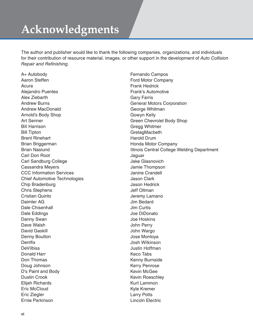 vi Acknowledgments The author and publisher would like to thank the following companies, organizations, and individuals for their contribution of resource material, images, or other support in the development of Auto Collision Repair and Refinishing. A+ Autobody Aaron Steffen Acura Alejandro Puentes Alex Ziebarth Andrew Burns Andrew MacDonald Arnold’s Body Shop Art Senner Bill Harrison Bill Tipton Brent Rinehart Brian Briggerman Brian Naslund Carl Don Root Carl Sandburg College Cassandra Meyers CCC Information Services Chief Automotive Technologies Chip Bradenburg Chris Stephens Cristian Quinto Daimler AG Dale Chisenhall Dale Eddings Danny Swan Dave Walsh David Gaskill Denny Boulton Dentfix DeVilbiss Donald Harr Don Thomas Doug Johnson D’s Paint and Body Dustin Crook Elijah Richards Eric McCloud Eric Ziegler Ernie Parkinson Fernando Campos Ford Motor Company Frank Hedrick Frank’s Automotive Gary Farris General Motors Corporation George Whitman Gowyn Kelly Green Chevrolet Body Shop Gregg Whitmer GretagMacbeth Harold Drum Honda Motor Company Illinois Central College Welding Department Jaguar Jake Glasnovich Jamie Thompson Janine Crandell Jason Clark Jason Hedrick Jeff Oltman Jeremy Lamano Jim Bedard Jim Curtis Joe DiDonato Joe Hoskins John Perry John Wargo Jose Montoya Josh Wilkinson Justin Hoffman Keco Tabs Kenny Burnside Kerry Penrose Kevin McGee Kevin Roeschley Kurt Lammon Kyle Kremer Larry Potts Lincoln Electric