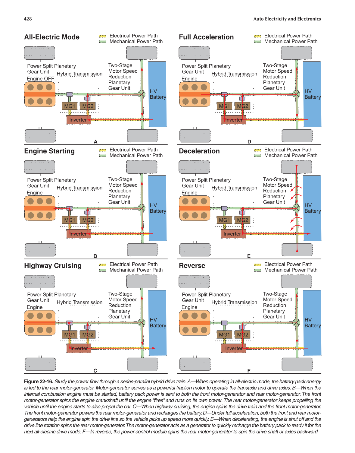 Figure 22-16. Study the power fl ow through a series-parallel hybrid drive train. A—When operating in all-electric mode, the battery pack energy