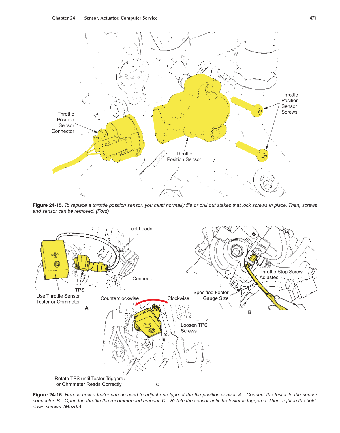 Figure 24-15. To replace a throttle position sensor, you must normally fi le or drill out stakes that lock screws in place. Then, screws