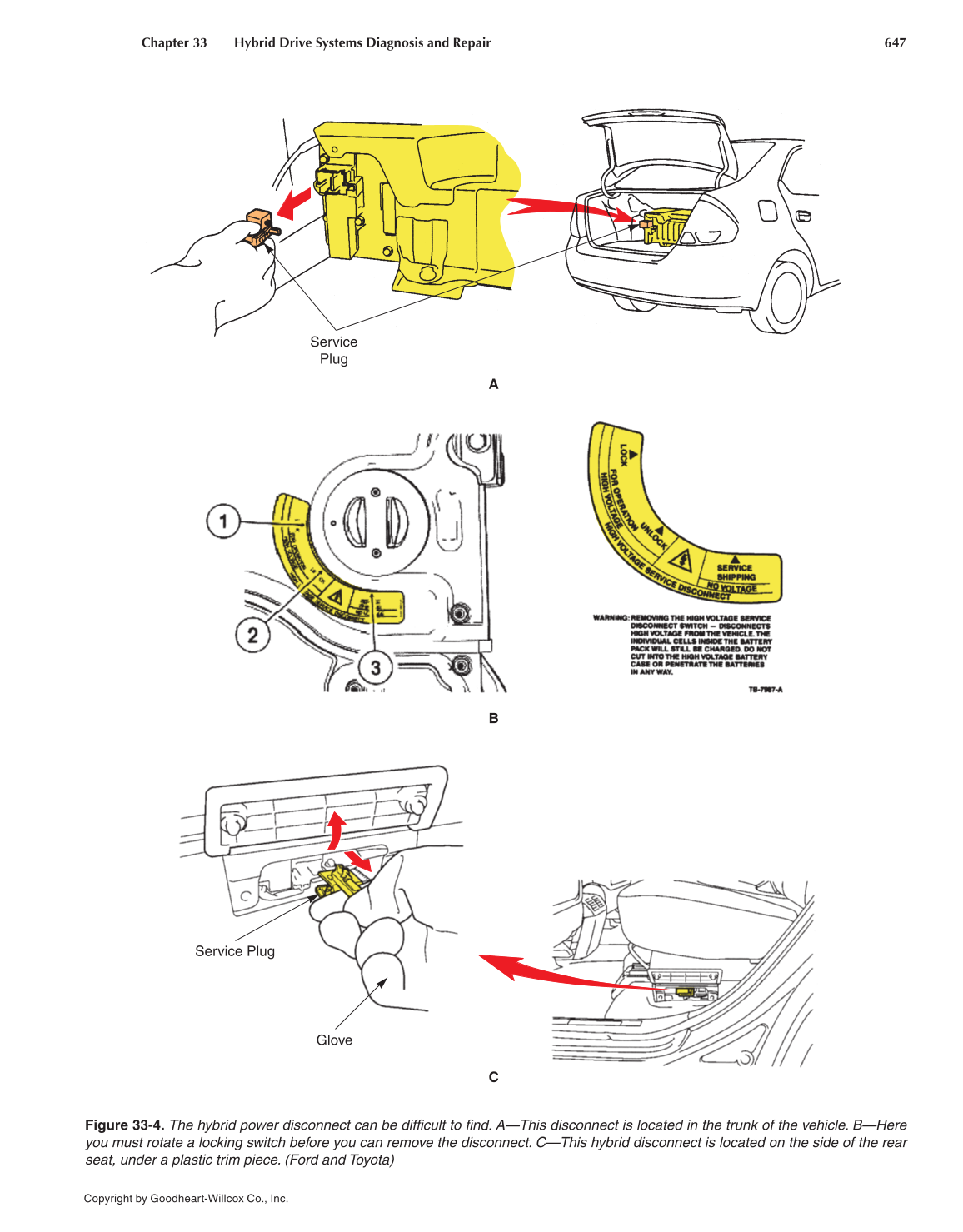Figure 33-4. The hybrid power disconnect can be diffi cult to fi nd. A—This disconnect is located in the trunk of the vehicle. B—Here