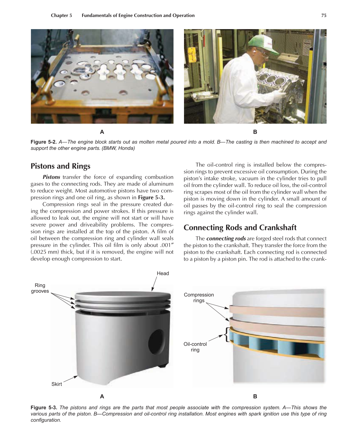 Figure 5-2. A—The engine block starts out as molten metal poured into a mold. B—The casting is then machined to accept and