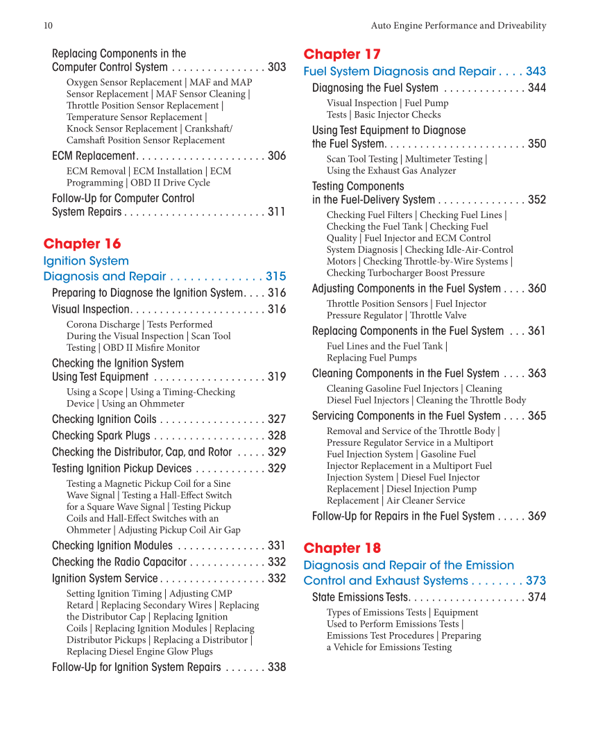 Replacing Components in the Computer Control System . . . . . . . . . . . . . . . . 303 Oxygen Sensor Replacement | MAF and MAP Sensor Replacement | MAF Sensor Cleaning | Th rottle Position Sensor Replacement | Temperature Sensor Replacement | Knock Sensor Replacement | Crankshaft / Camshaft Position Sensor Replacement ECM Replacement. . . . . . . . . . . . . . . . . . . . . . 306 ECM Removal | ECM Installation | ECM Programming | OBD II Drive Cycle Follow-Up for Computer Control System Repairs . . . . . . . . . . . . . . . . . . . . . . . . 311 Chapter 16 Ignition System Diagnosis and Repair . . . . . . . . . . . . . . 315 Preparing to Diagnose the Ignition System. . . . 316 Visual Inspection. . . . . . . . . . . . . . . . . . . . . . . 316 Corona Discharge | Tests Performed During the Visual Inspection | Scan Tool Testing | OBD II Misfi re Monitor Checking the Ignition System Using Test Equipment . . . . . . . . . . . . . . . . . . . 319 Using a Scope | Using a Timing-Checking Device | Using an Ohmmeter Checking Ignition Coils . . . . . . . . . . . . . . . . . . 327 Checking Spark Plugs . . . . . . . . . . . . . . . . . . . 328 Checking the Distributor, Cap, and Rotor . . . . . 329 Testing Ignition Pickup Devices . . . . . . . . . . . . 329 Testing a Magnetic Pickup Coil for a Sine Wave Signal | Testing a Hall-Eff ect Switch for a Square Wave Signal | Testing Pickup Coils and Hall-Eff ect Switches with an Ohmmeter | Adjusting Pickup Coil Air Gap Checking Ignition Modules . . . . . . . . . . . . . . . 331 Checking the Radio Capacitor . . . . . . . . . . . . . 332 Ignition System Service . . . . . . . . . . . . . . . . . . 332 Setting Ignition Timing | Adjusting CMP Retard | Replacing Secondary Wires | Replacing the Distributor Cap | Replacing Ignition Coils | Replacing Ignition Modules | Replacing Distributor Pickups | Replacing a Distributor | Replacing Diesel Engine Glow Plugs Follow-Up for Ignition System Repairs . . . . . . . 338 Chapter 17 Fuel System Diagnosis and Repair . . . . 343 Diagnosing the Fuel System . . . . . . . . . . . . . . 344 Visual Inspection | Fuel Pump Tests | Basic Injector Checks Using Test Equipment to Diagnose the Fuel System. . . . . . . . . . . . . . . . . . . . . . . . 350 Scan Tool Testing | Multimeter Testing | Using the Exhaust Gas Analyzer Testing Components in the Fuel-Delivery System . . . . . . . . . . . . . . . 352 Checking Fuel Filters | Checking Fuel Lines | Checking the Fuel Tank | Checking Fuel Quality | Fuel Injector and ECM Control System Diagnosis | Checking Idle-Air-Control Motors | Checking Th rottle-by-Wire Systems | Checking Turbocharger Boost Pressure Adjusting Components in the Fuel System . . . . 360 Th rottle Position Sensors | Fuel Injector Pressure Regulator | Th rottle Valve Replacing Components in the Fuel System . . . 361 Fuel Lines and the Fuel Tank | Replacing Fuel Pumps Cleaning Components in the Fuel System . . . . 363 Cleaning Gasoline Fuel Injectors | Cleaning Diesel Fuel Injectors | Cleaning the Th rottle Body Servicing Components in the Fuel System . . . . 365 Removal and Service of the Th rottle Body | Pressure Regulator Service in a Multiport Fuel Injection System | Gasoline Fuel Injector Replacement in a Multiport Fuel Injection System | Diesel Fuel Injector Replacement | Diesel Injection Pump Replacement | Air Cleaner Service Follow-Up for Repairs in the Fuel System . . . . . 369 Chapter 18 Diagnosis and Repair of the Emission Control and Exhaust Systems . . . . . . . . 373 State Emissions Tests. . . . . . . . . . . . . . . . . . . . 374 Types of Emissions Tests | Equipment Used to Perform Emissions Tests | Emissions Test Procedures | Preparing a Vehicle for Emissions Testing 10 Auto Engine Performance and Driveability