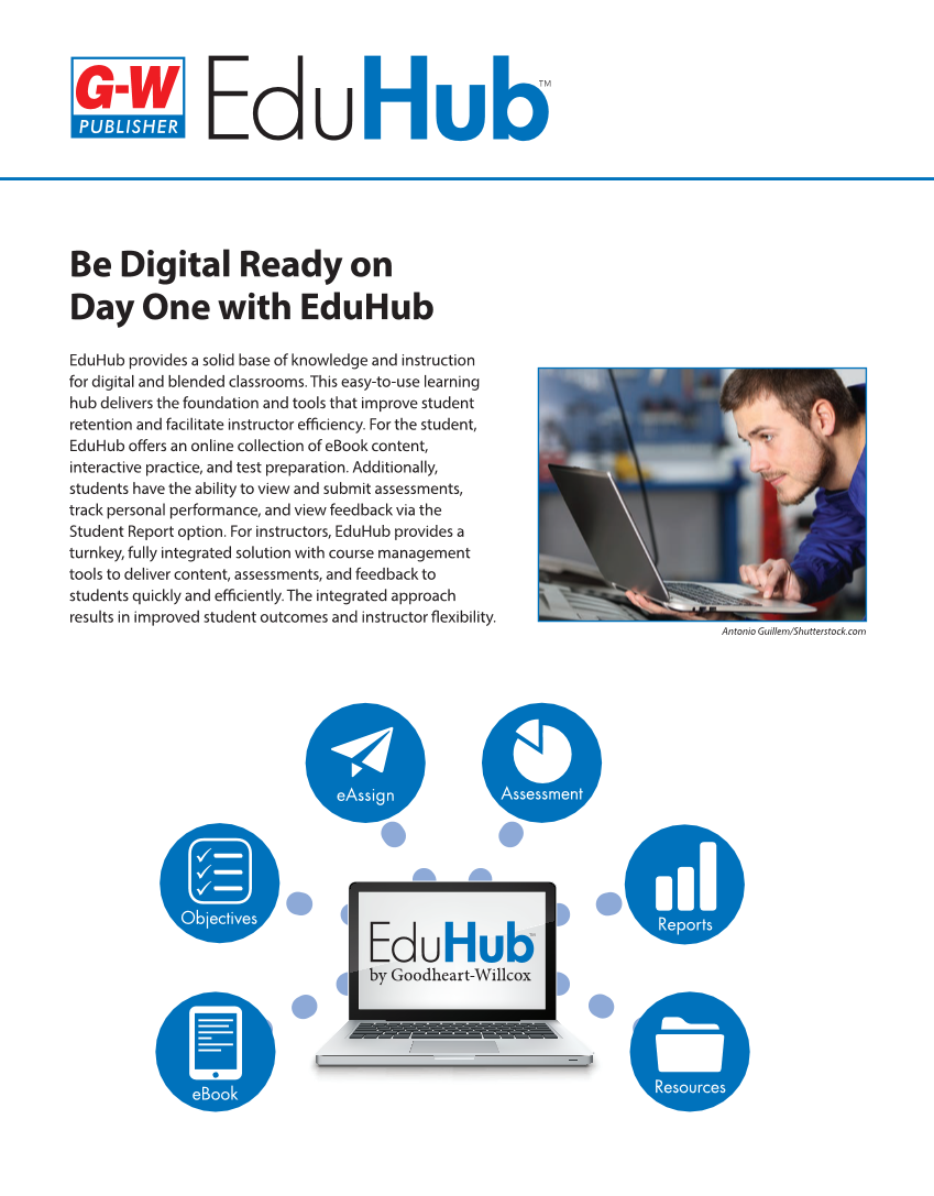 eBook Objectives eAssign Reports Resources Assessment Be Digital Ready on Day One with EduHub EduHub provides a solid base of knowledge and instruction for digital and blended classrooms. This easy-to-use learning hub delivers the foundation and tools that improve student retention and facilitate instructor effi ciency. For the student, EduHub off ers an online collection of eBook content, interactive practice, and test preparation. Additionally, students have the ability to view and submit assessments, track personal performance, and view feedback via the Student Report option. For instructors, EduHub provides a turnkey, fully integrated solution with course management tools to deliver content, assessments, and feedback to students quickly and effi ciently. The integrated approach results in improved student outcomes and instructor fl exibility. Antonio Guillem/Shutterstock.com