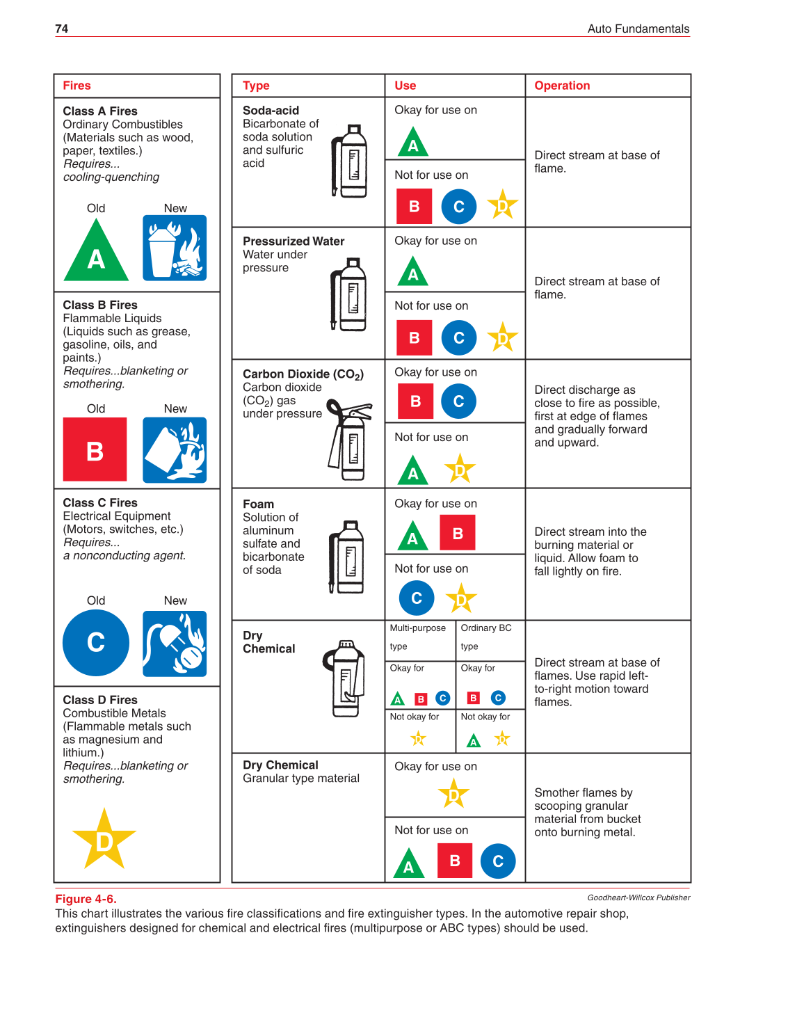 This chart illustrates the various fi re classifi cations and fi re extinguisher types. In the automotive repair shop,