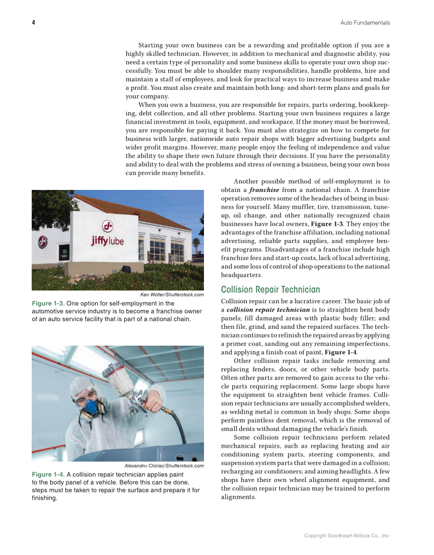 Copyright Goodheart-Willcox Co., Inc. Auto Fundamentals 4 Starting your own business can be a rewarding and profitable option if you are a highly skilled technician. However, in addition to mechanical and diagnostic ability, you need a certain type of personality and some business skills to operate your own shop suc- cessfully. You must be able to shoulder many responsibilities, handle problems, hire and maintain a staff of employees, and look for practical ways to increase business and make a profit. You must also create and maintain both long- and short-term plans and goals for your company. When you own a business, you are responsible for repairs, parts ordering, bookkeep- ing, debt collection, and all other problems. Starting your own business requires a large financial investment in tools, equipment, and workspace. If the money must be borrowed, you are responsible for paying it back. You must also strategize on how to compete for business with larger, nationwide auto repair shops with bigger advertising budgets and wider profit margins. However, many people enjoy the feeling of independence and value the ability to shape their own future through their decisions. If you have the personality and ability to deal with the problems and stress of owning a business, being your own boss can provide many benefits. Another possible method of self-employment is to obtain a franchise from a national chain. A franchise operation removes some of the headaches of being in busi- ness for yourself. Many muffler, tire, transmission, tune- up, oil change, and other nationally recognized chain businesses have local owners, Figure 1-3. They enjoy the advantages of the franchise affiliation, including national advertising, reliable parts supplies, and employee ben- efit programs. Disadvantages of a franchise include high franchise fees and start-up costs, lack of local advertising, and some loss of control of shop operations to the national headquarters. Collision Repair Technician Collision repair can be a lucrative career. The basic job of a collision repair technician is to straighten bent body panels fill damaged areas with plastic body filler and then file, grind, and sand the repaired surfaces. The tech- nician continues to refinish the repaired areas by applying a primer coat, sanding out any remaining imperfections, and applying a finish coat of paint, Figure 1-4. Other collision repair tasks include removing and replacing fenders, doors, or other vehicle body parts. Often other parts are removed to gain access to the vehi- cle parts requiring replacement. Some large shops have the equipment to straighten bent vehicle frames. Colli- sion repair technicians are usually accomplished welders, as welding metal is common in body shops. Some shops perform paintless dent removal, which is the removal of small dents without damaging the vehicle’s finish. Some collision repair technicians perform related mechanical repairs, such as replacing heating and air conditioning system parts, steering components, and suspension system parts that were damaged in a collision recharging air conditioners and aiming headlights. A few shops have their own wheel alignment equipment, and the collision repair technician may be trained to perform alignments. Ken Wolter/Shutterstock.com Figure 1-3. One option for self-employment in the automotive service industry is to become a franchise owner of an auto service facility that is part of a national chain. Alexandru Chiriac/Shutterstock.com Figure 1-4. A collision repair technician applies paint to the body panel of a vehicle. Before this can be done, steps must be taken to repair the surface and prepare it for finishing.
