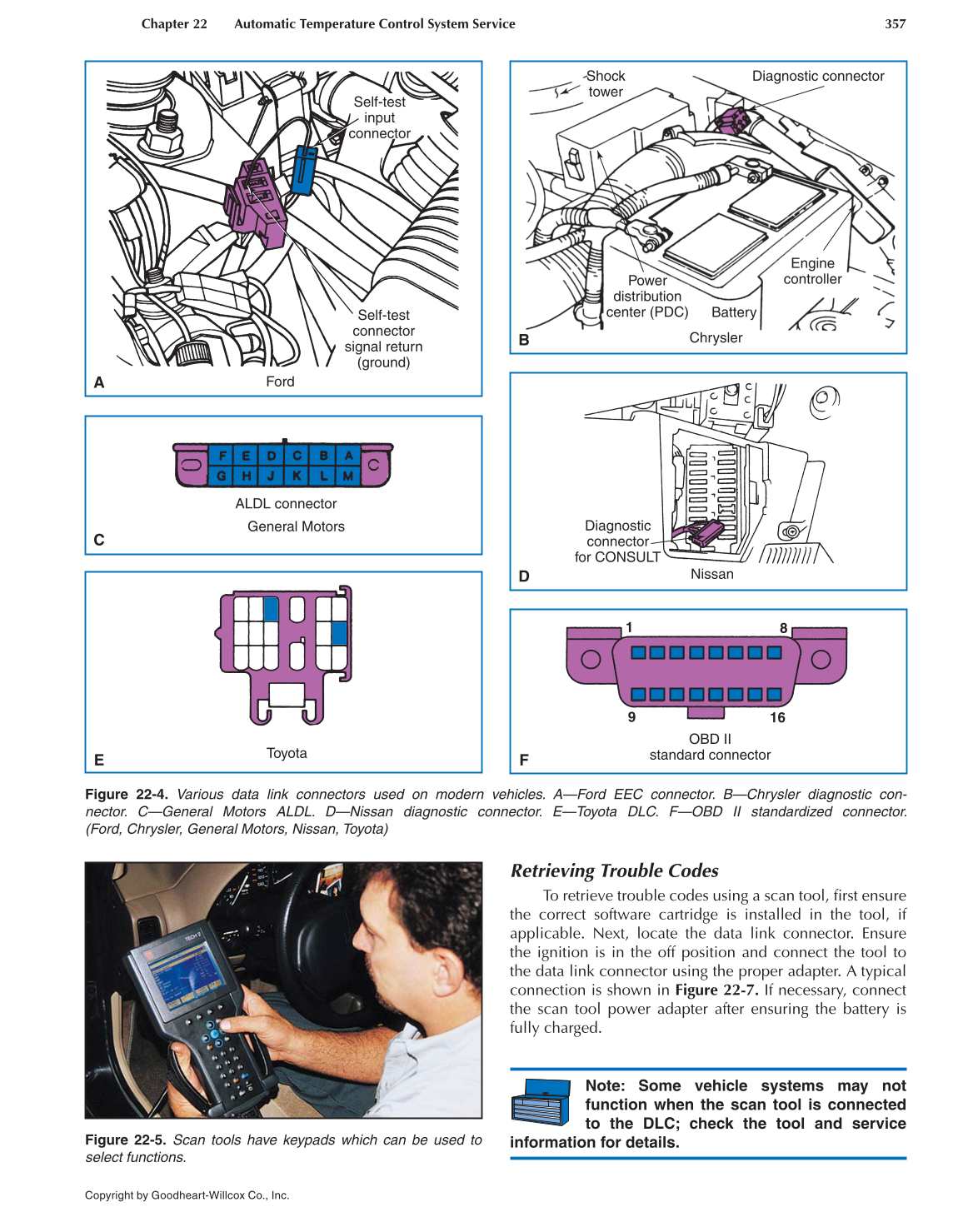Figure 22-4. Various data link connectors used on modern vehicles. A—Ford EEC connector. B—Chrysler diagnostic con-