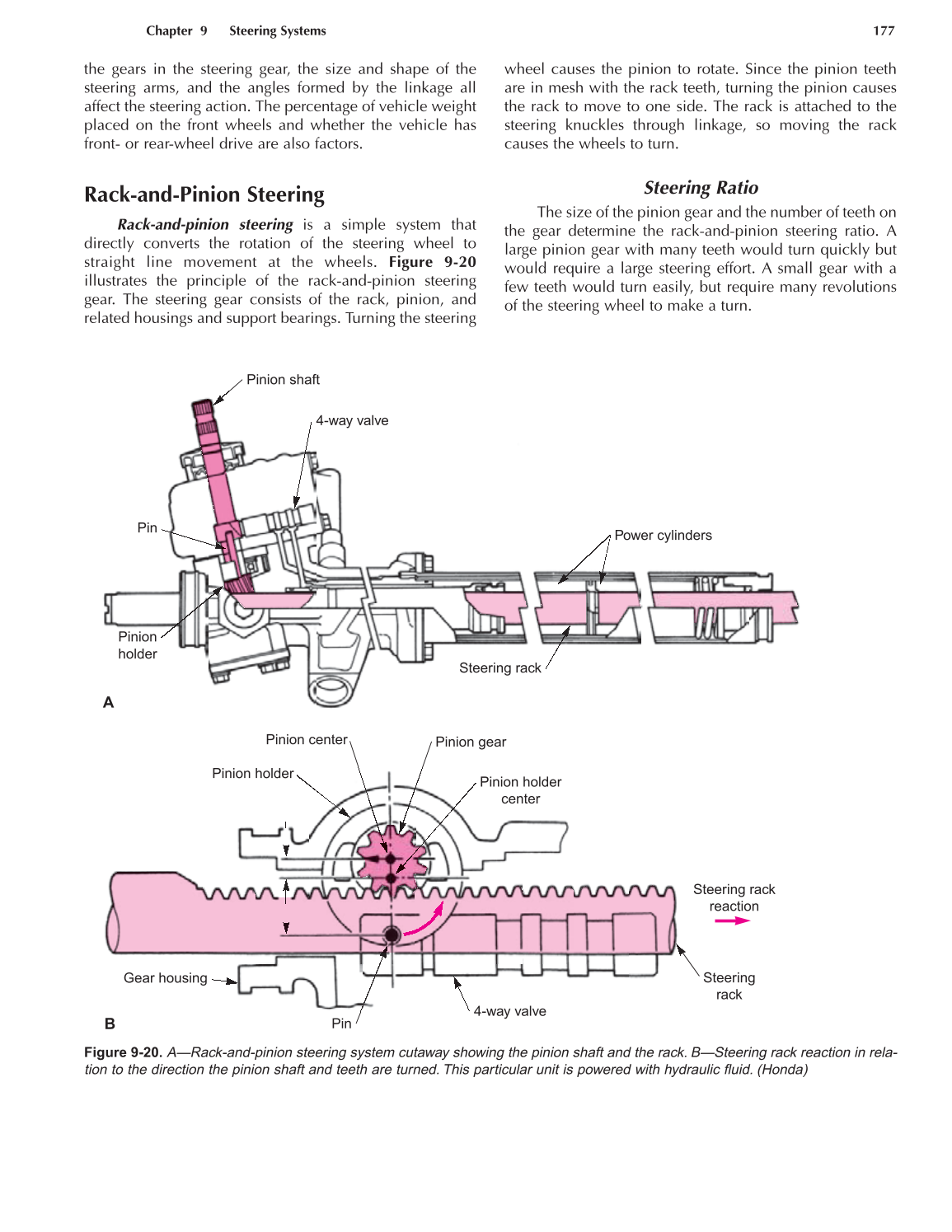 Figure 9-20. A—Rack-and-pinion steering system cutaway showing the pinion shaft and the rack. B—Steering rack reaction in rela-