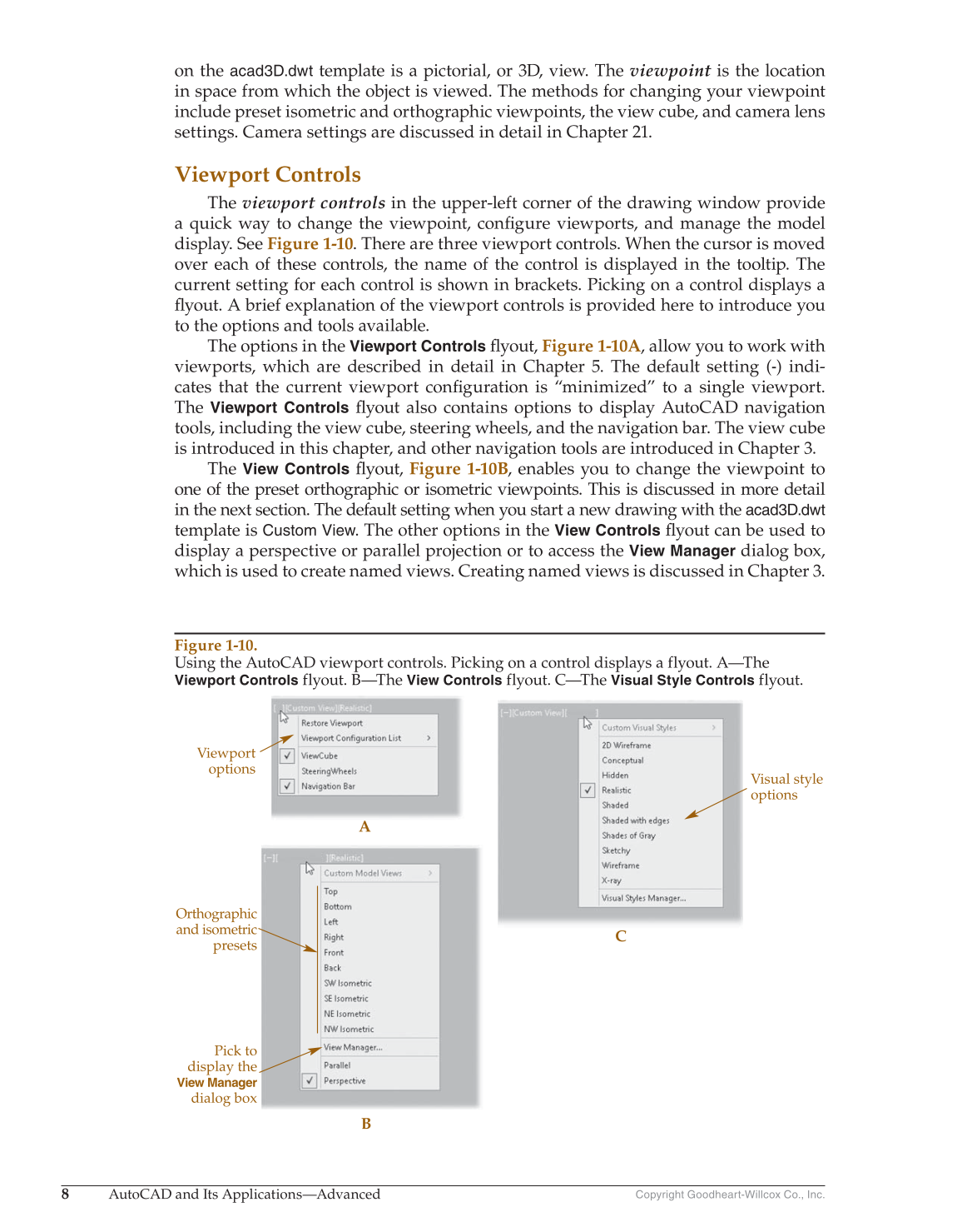 fl yout, Figure 1-10B, enables you to change the viewpoint to