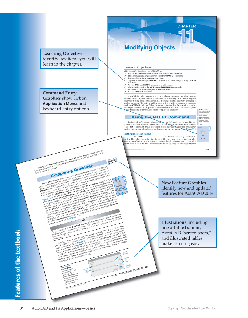Drawing Problems - Chapter 1 Features of the textbook iv AutoCAD and Its Applications—Basics Copyright Goodheart-Willcox Co., Inc. 305 Copyright Goodheart-Willcox Co., Inc.. Learning Objectives After completing this chapter, you will be able to: ✓ Use the FILLET command to draw fi llets, rounds, and other radii. ✓ Place chamfers and angled corners with the CHAMFER command. ✓ Form a spline using the BLEND command. ✓ Separate objects using the BREAK command and combine objects using the JOIN command. ✓ Use the TRIM and EXTEND commands to edit objects. ✓ Change objects using the STRETCH and LENGTHEN commands. ✓ Edit the size of objects using the SCALE command. ✓ Use the EXPLODE command. AutoCAD includes many editing commands and options to complete common drafting tasks, improve efficiency, and modify a drawing. This chapter explains methods of using basic editing commands to change existing objects by changing or adding geometry. The editing method used in this chapter is to access a command such as STRETCH and then follow the prompts to complete the operation. Another technique, presented in Chapter 13, is to select objects fi rst using the crosshairs, then access the editing command, and fi nally complete the operation. Using the FILLET Command Using the FILLET Co mmand Design and drafting terminology refers to a rounded interior corner as a fi llet and a rounded exterior corner as a round. AutoCAD refers to all rounded corners as fi llets. The FILLET command draws a rounded corner between intersecting or noninter- secting lines, arcs, circles, ellipses, polylines, splines, xlines, and rays. See Figure 11-1. Setting the Fillet Radius Access the FILLET comman nd an nd then use the Radius option to specify the fi llet radius.. The radius determiness the size of a fi llet and must be set before you select objects.. AutoCAD stores the radius as the new default, allowing you to place addi- tional fi lletss of the same size.. Once you define the radius, select the fi rst object and then fillet: A rounded interior corner used to relieve stress or ease the contour of inside corners. round: A rounded exterior corner used to remove sharp edges or ease the contour of exterior corners. FILLET Ribbon Home Modify Fillet Type FILLET ROUND F Modifying Objects CHAPTER 11 11 F eat u res o f t h e text b oo k Copyri Co py y p righ t Goodheart-Willcox C o ., In c Ac c ess t h e F ILLE T c o mm a d a d t h e n u r a d i u s Th e r a di u s d e te r mi n e t h e s i ze o f a ob je c t s Au t o C A D s t o r es t h e r a d i u s as t h e n t i o n a l fi ll et o f t h e sa m e s i ze O n c e y o u d e fi n e Chapter 15 Obtaining Drawing Information 443 Willcox Co., Inc. Copyright Goodheart-Willcox Co., Inc. Picking the Properties button on the QuickCalc palette displays a shortcut menu. The settings allow you to change the palette appearance, including its ability to dock, hide, or appear transparent. Compisring aused Drthewingbetween a s Comp a ring Dr a wing s The COMPARE command to evaluate differences two drawing fi les. The fi les selected for comparison are overlaid in a newly created comparison drawing that displays the similarities and differences between the drawings. Use the COMPARE command when it is necessary to observe and document the differences between two drawings, such as when you are working on a design project and other members of the project team make changes to the design. Access the COMPARE command to display the DWG Compare dialog box. See Fto igure 15-26 . To activate the COMPARE command when no drawing is open, select DWG Compare in the Application Menu. Use the DWG 1 area to specify the fi rst drawing compare, designated DWG 1. If a fi le is open, current, and has been saved, it is listed as DWG 1. To select a different fi le, use the recent fi les drop-down menu or pick the ellipsis (… ) button and select a fi le in the Select a drawing to compare dialog box . Next, use the DWG 2 area to specify the second drawing to compare, designated DWG 2. In the comparison drawing that is created, any objects that are unique to DWG 1 are dark green (color 82) by default. Any objects that are unique to DWG 2 are red (color 1). To select different colors, pick the DWG 1 and DWG 2 color swatches to open the Select Color dialog box and select the desired colors. Once you specify the drawings to compare, pick the Compare button to create the comparison drawing and display the Compare contextual ribbon tab. See F igure 15-27. NOTE NOTE The general intent of the COMPARE command is to help evaluate a design before and after changes have been made. Therefore, DWG 1 and DWG 2 are typically separate fi les with unique names. AutoCAD alerts you if you select the same drawing fi le for DWG 1 and DWG 2. AutoCAD starts a new drawing fi le named Compare_DWG 1 vs DWG 2 where DWG 1 and DWG 2 represent the two fi le names. You can change the default name when you save the fi le. In F igure 15-27 , a residential fl oor plan saved by one drafter, named A-02-MMM , is compared to the same fl oor plan modifi ed by a second drafter, named A-02-DPM . AutoCAD names the new comparison drawing Compare_A-02-MMM vs A-02-DPM . In the new drawing, DWG 1 and DWG 2 objects are combined into single block objects. Blocks are explained later in this textbook. The comparison drawing contains layers from both drawings. Layer names are followed by _DWG1 or _DWG2 to distinguish the layers in each drawing. NEW AutoCAD COMPARE Ribbon Collaborate Compare DWG Compare Application Menu Drawing Utilities DWG Compare Type COMPARE F igure 15-26. Use the DWG Compare dialog box to specify two drawing files to compare and preset the colors assigned to objects that are different between the drawings. Specify DWG 1 Specify DWG 2 Pick to select a file Pick to select a color Lear ning Objectives identify key items you will learn in the chapter. New Feature Graphics identify new and updated features for AutoCAD 2019 Command Entry Gr