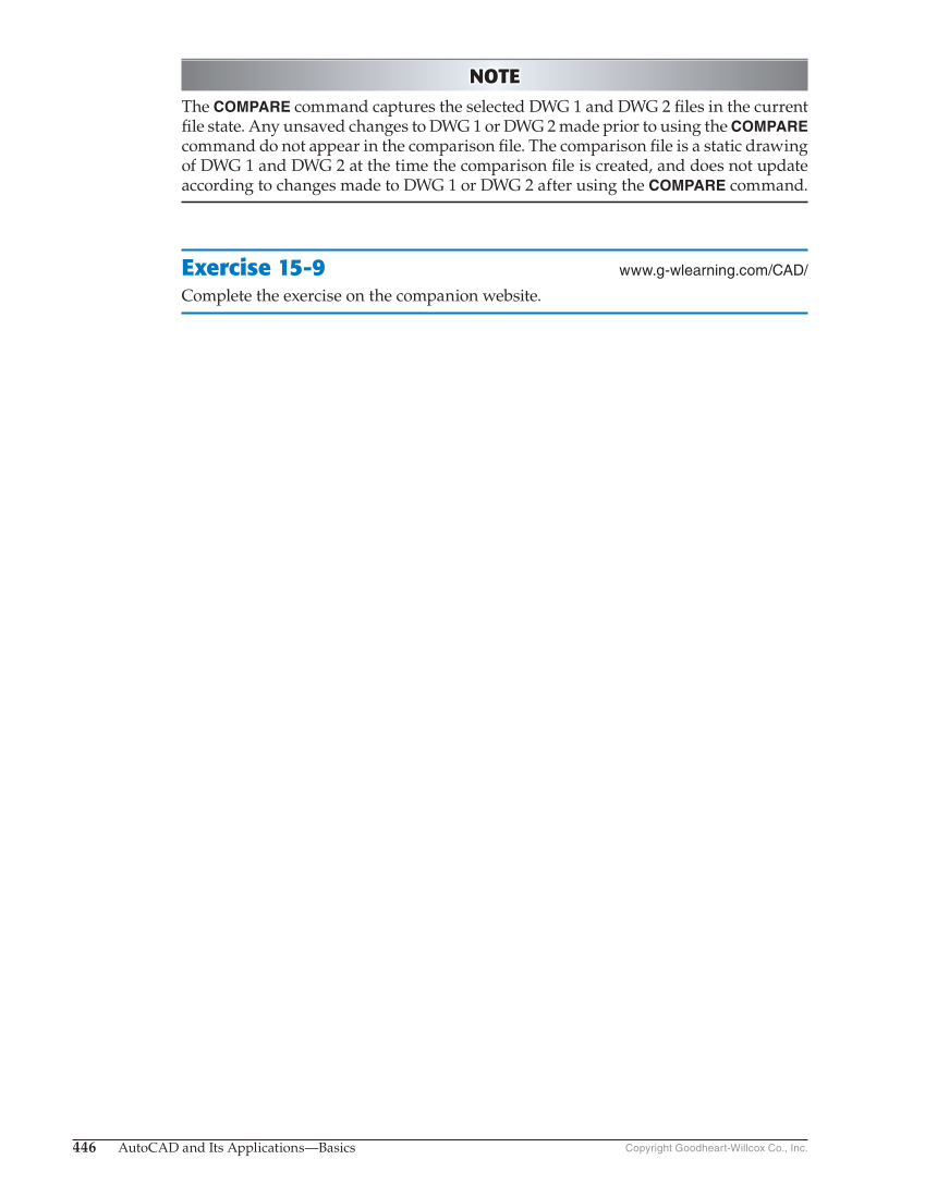 446 AutoCAD and Its Applications—Basics Copyright Goodheart-Willcox Co., Inc. NOTE NOTE The COMPARE command captures the selected DWG 1 and DWG 2 fi les in the current fi le state. Any unsaved changes to DWG 1 or DWG 2 made prior to using the COMPARE command do not appear in the comparison fi le. The comparison fi le is a static drawing of DWG 1 and DWG 2 at the time the comparison fi le is created, and does not update according to changes made to DWG 1 or DWG 2 after using the COMPARE command. Exercise 15-9 www.g-wlearning.com/CAD/ Complete the exercise on the companion website.
